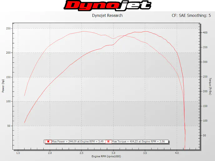We strapped the Titan XD down to our Dynojet dynamometer to see what the real-world numbers looked like. Our best run showed the truck made 244.1 horsepower and 404.2 lb-ft of torque. Looking deeper at the graph, we noticed the power band started nice and low near 1,600 rpm, and horsepower showed a nearly perfect power curve before reaching its pinnacle at around 3,500 rpm. Torque, meanwhile, ramped up quickly from 1,600 to 2,000 rpm, increasing all the way to 2,500 rpm. After that, it dropped off (excepting a couple of bumps near 2,800 and 3,100 rpm).