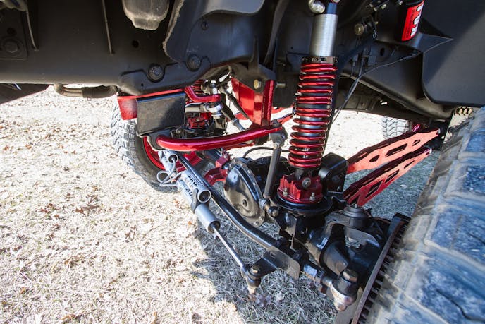 A TGC dual stabilizer kit with Fox 2.0 reservoir shocks resides up front. It gets a hand from the Dodge Offroad upgraded heim crossover steering as well. A Red Head Steering Gears upgraded gearbox with hydraulic assist ports makes sure everything works together safely. Additional components include a custom track bar drop bracket bolted to a BDS adjustable track bar. In true show quality, all of the lift pieces and axles are powder coated.