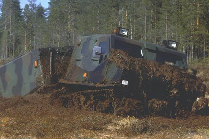Utilizing 620mm-wide molded rubber tracks, the Viking’s maximum ground pressure is roughly equivalent to the Bv 206. This is despite the fact that the Viking weighs about four tons more. It can ford through up to five feet of water without any preparation. Full amphibious capability is said to be possible with less than two minutes of preparation.