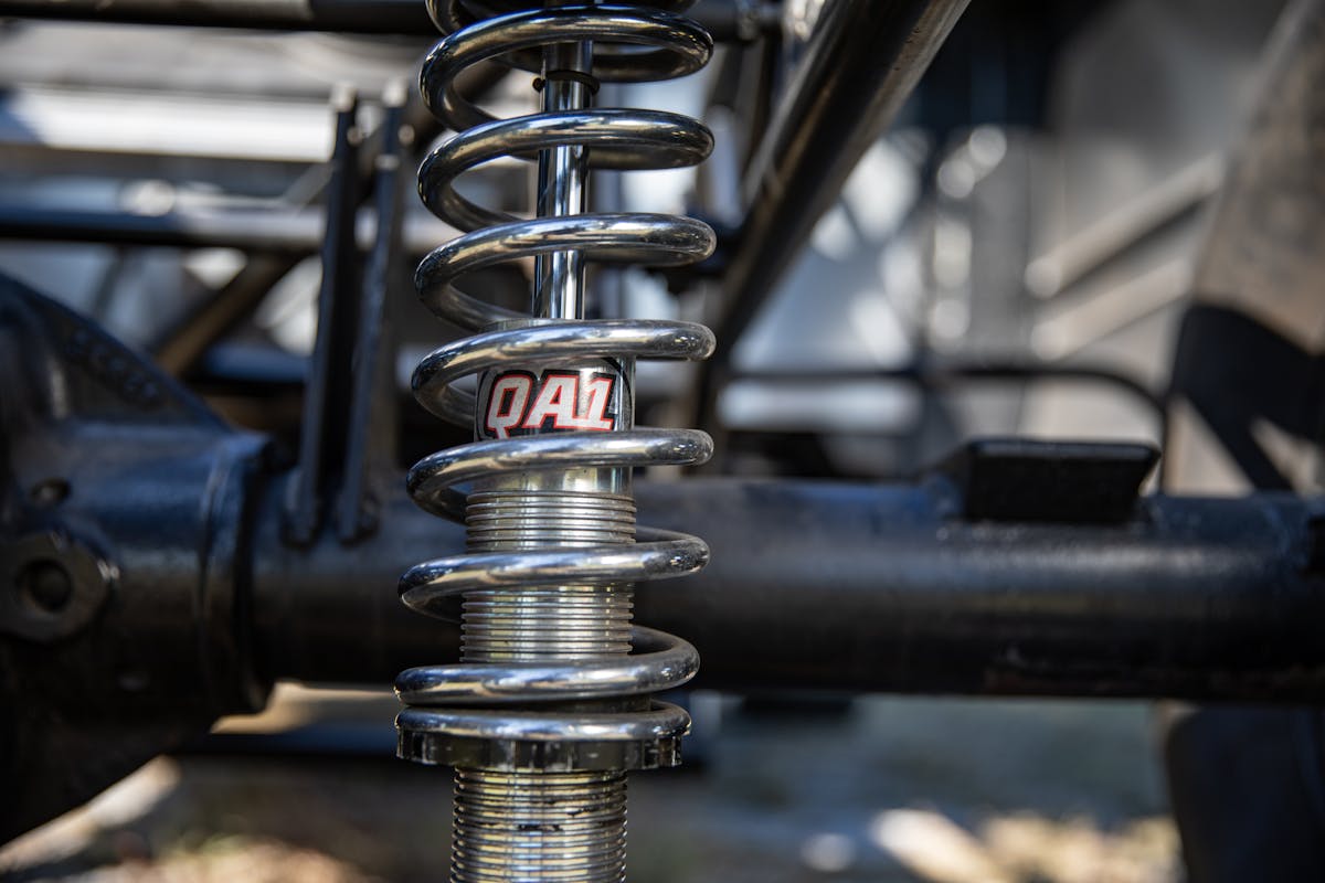 A custom four-link rear suspension locates a Dana 70 rearend, which helps the 29.5-inch Mickey Thompson slicks bite the track. A Dana 60 resides up front, with QA1 coilovers at all four corners, which are largely responsible for the 1.2x sixty-foot times. An NP241DLD transfer case connects both axles.