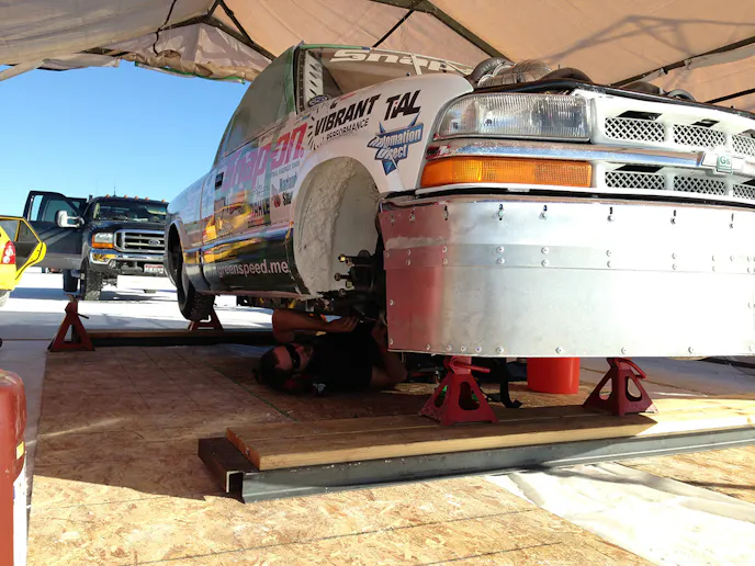 They had almost no safety equipment on the truck, no windshield, parachute or fire extinguisher. They knew it wouldn’t pass tech inspection, but they got in line to tech to find out exactly what they needed to fix. After working almost nonstop for two days, they rolled into tech Thursday night. By Friday at 11 am, they passed tech but Speed Week closed at 12.