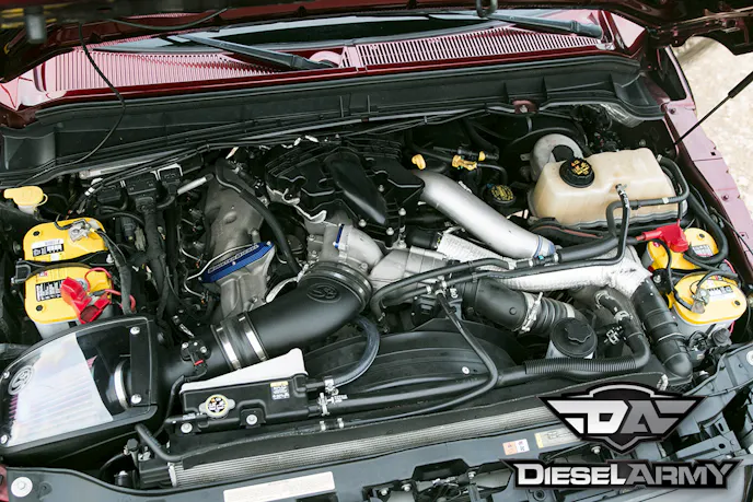 Olivo kept the engine pretty much the way the factory built it. The 6.7 Power Stroke breathes through an S&B Filters intake and the engine only receives fresh air thanks to a Sinister Diesel EGR delete kit. The exhaust is routed through a Flo~Pro exhaust system. To make sure that the truck has enough juice to turn over after powering the stereo at shows, Olivo opted to install two yellow top Optima Batteries.