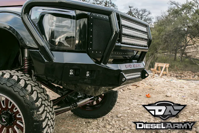 Once the truck was standing tall, Olivo focused on making it look a little more aggressive. The front and rear bumpers were upgraded to a set of Road Armor bumpers. These massive bumpers make you instantly take notice and won’t be ignored.