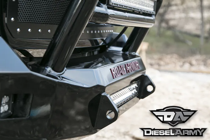 The front bumper rocks a Road Armor Lonestar Guard which serves as the perfect place to mount three 30-inch Rigid Industries LED light bars. With the bars in place, it is a little hard to see the Rogue Offroad grille, but it is certainly there and provides a refined background for all of these lights.