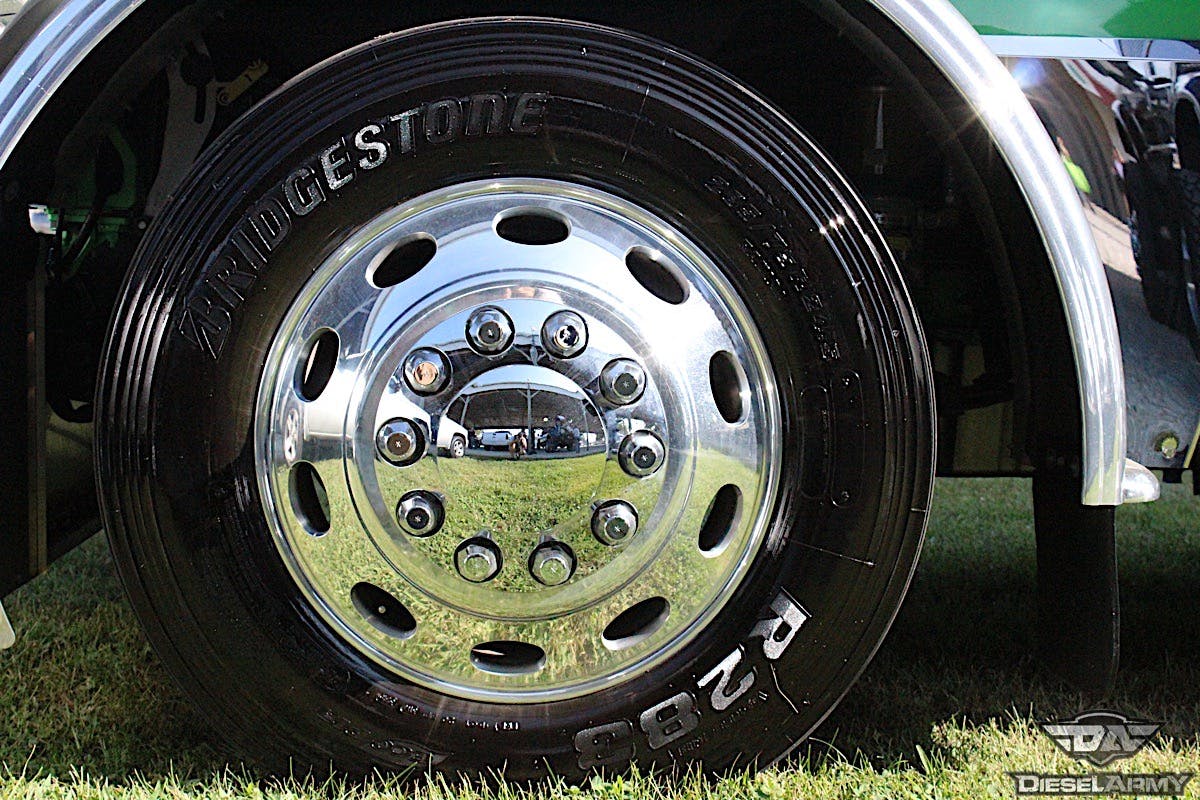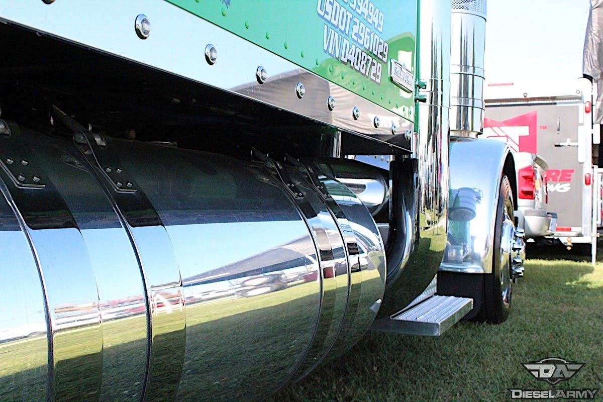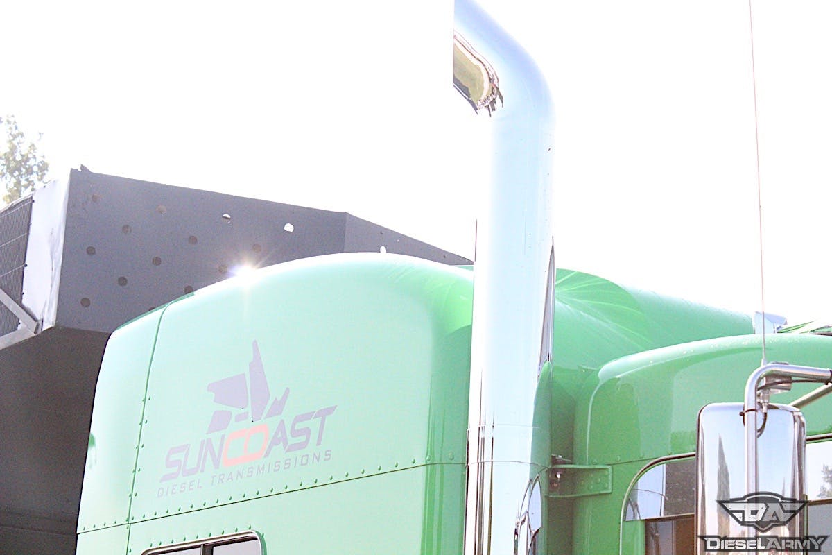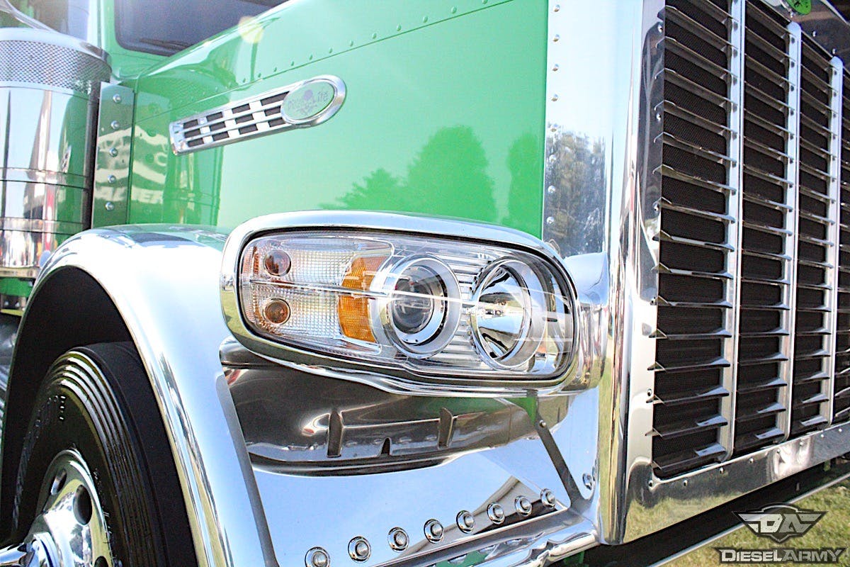 The new upgrades included new sleeper panels, stainless deck plating, custom steering wheel and shifter, and dual revolution lighting all around the truck that light up green as well to match the color of the truck.