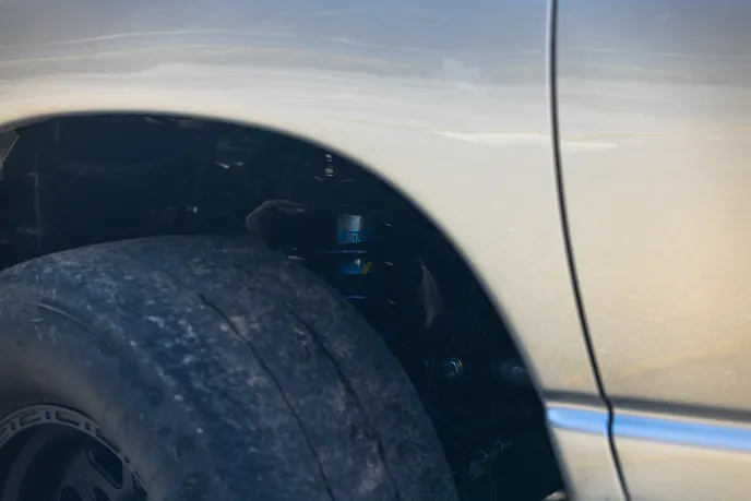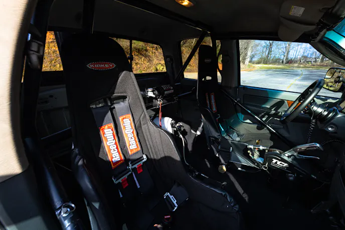 On the inside, everything that should be there for something fast is. The factory interior is intact, but a safe 8.50 certified cage from SK Diesel Service surrounds it. Two Kirkey seats replace the factory ones, and RaceQuip harnesses keep Chris and a passenger strapped in. Where a back seat once sat now sits two 15lb nitrous bottles.