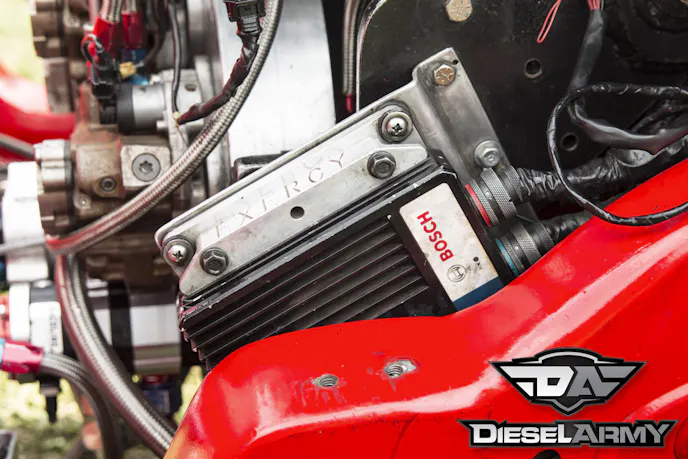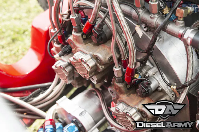 Injectors this large require a huge amount of high-pressure fuel and a single CP3 wouldn’t support them. In fact, two CP3s wouldn’t support them. Kusilek custom-designed a gearbox to run three S&S Diesel Motorsports CP3 pumps that have 10mm plungers. The three CP3s all feed a main fuel rail mounted on top of the gearbox. Then, the main fuel rail has two feeds, one for each cylinder head. The individual fuel rails are mounted under the valve covers.