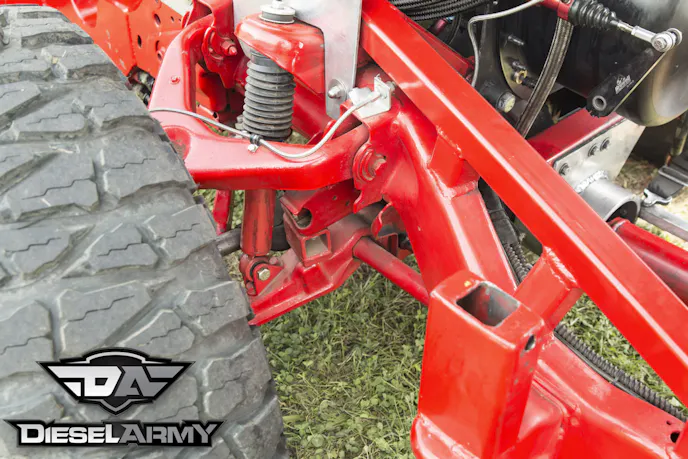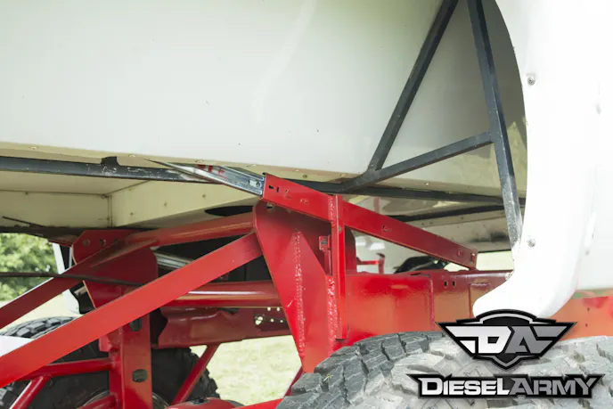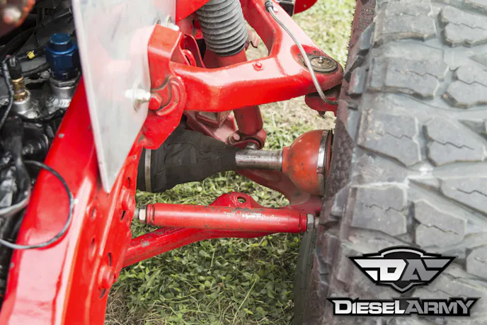 The full-blown pulling truck started life as a 2013 2500 GMC Sierra Denali. Once everything was stripped down, the frame was braced and painted red. In the back, a custom Rockwell SQHD rearend was solidly mounted to the frame. Up front, Kusilek kept the factory front torsion suspension, but upgraded to a custom independent F106 Rockwell front axle built by Proformance Pros.
