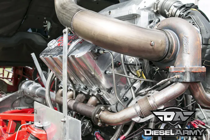 Injectors this large require a huge amount of high-pressure fuel and a single CP3 wouldn’t support them. In fact, two CP3s wouldn’t support them. Kusilek custom-designed a gearbox to run three S&S Diesel Motorsports CP3 pumps that have 10mm plungers. The three CP3s all feed a main fuel rail mounted on top of the gearbox. Then, the main fuel rail has two feeds, one for each cylinder head. The individual fuel rails are mounted under the valve covers.