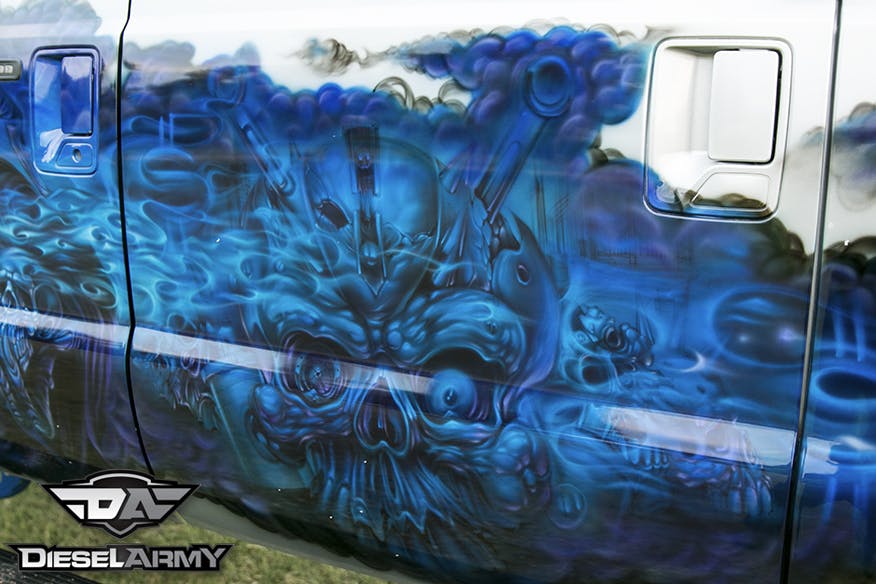 Lighting all around was increased using Recon Mirror Lights, LED Third Brake Light and LED Smoked Lens Taillights. The Original Equipment Ford headlights were meticulously taken apart and custom airbrushed. The airbrushing is one of the qualities that has really set this truck head and shoulders above the rest. Juan Carlos of Chicago, Illinois hand brushed every bit of custom paint on this Ford. Countless hours of finger cramping work were put into the art along nearly every panel of this truck. Every skull, flame, and smoke line was freehand painted without using a single stencil. Using silver as a base, the truck was accented with various shades of blue and black that form some gruesomely awesome scenes. Carlos even worked the truck’s back up sensors into a couple of the skulls on the rear bumper to keep everything blended perfectly.