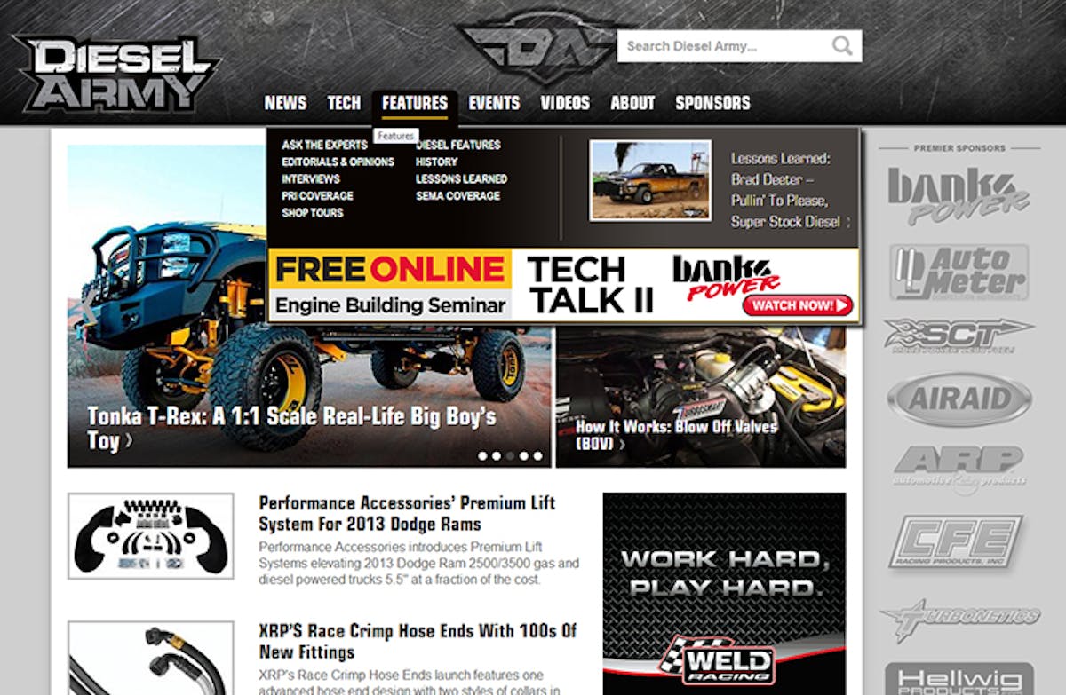 Diesel Army is part of the Power Automedia family. That means collectively, we are one of 10 other automotive performance publications. So, while we are a new magazine, our parents have been around for quite some time. When deciding on the layout of the magazine, we wanted to go “beyond the pages” of a standard print publication. So, we are 100% digital. With all digital content, we don’t have to charge you for a subscription (we are free!), we aren’t limited to page count, we can add as many photos as we need to properly convey each piece, we can tell the stories our way and include awesome video content to boot. So, who are we? We are your number one resource for technical stories, in-depth interviews, how things work, excellent video coverage, a great place for vehicle features (both “pretty trucks” and “functional trucks”) and the best place for up-to-the-minute news and event coverage! Now let’s talk about all that you can expect from us.
