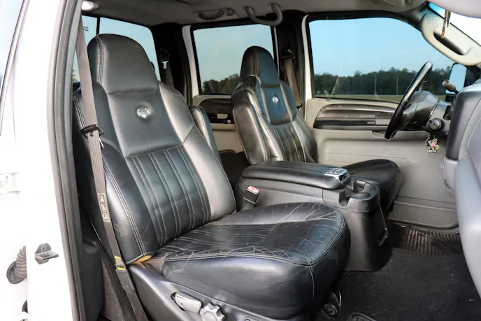 Out back, Alec installed a 2008 Super Duty tailgate (also color-matched by Herbie) along with the factory rear bumper. The tailgate features black “SUPER DUTY” lettering and a white and black oval emblem to match the front. The door and tailgate handles were also given a spray of Oxford White paint to match the rest of the truck.