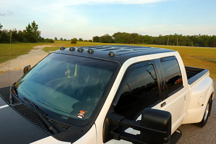 A set of Anzo USA LED taillights round out the updated look in the rear. The bright white paint is offset by black vinyl that Dino installed on the hood and roof of the truck to make it stand out as different from other Fords. A set of smoked Recon cab marker lights blend in with the black vinyl on the roof, making their presence known only when they are illuminated.