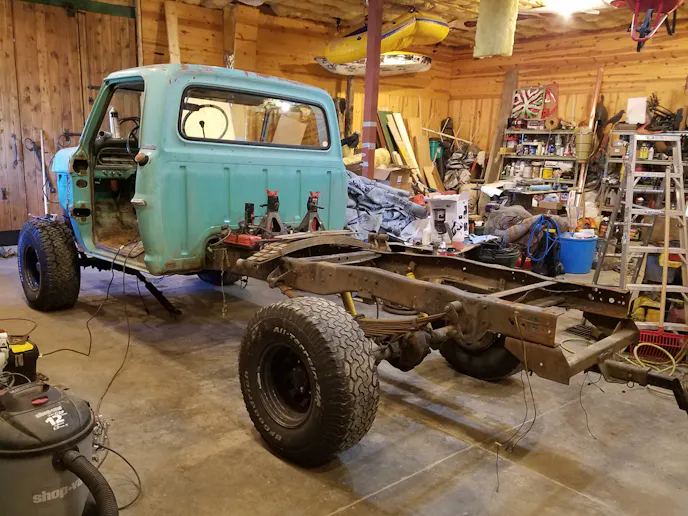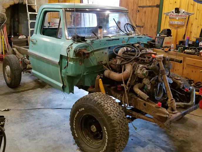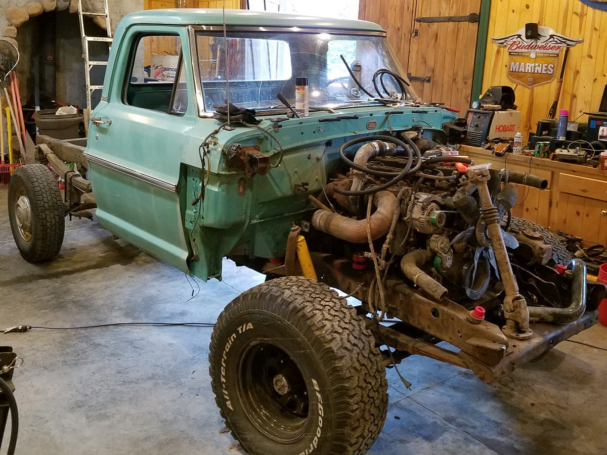 Brian began tearing down all three of the pickups and rearranging the pieces in the summer of 2016. “I put the Dodge’s rear Dana 70 and leaf springs onto the F-250’s rear, which would support heavy loads, and did a Chevy Dana 44 with 2005 Super Duty coil springs up front, which would support the weight of the Cummins,” explained Brian. “Then I put the Cummins in with the Dodge Getrag transmission and an NP205 transfer case. After that, the F-100’s body went on top.”
