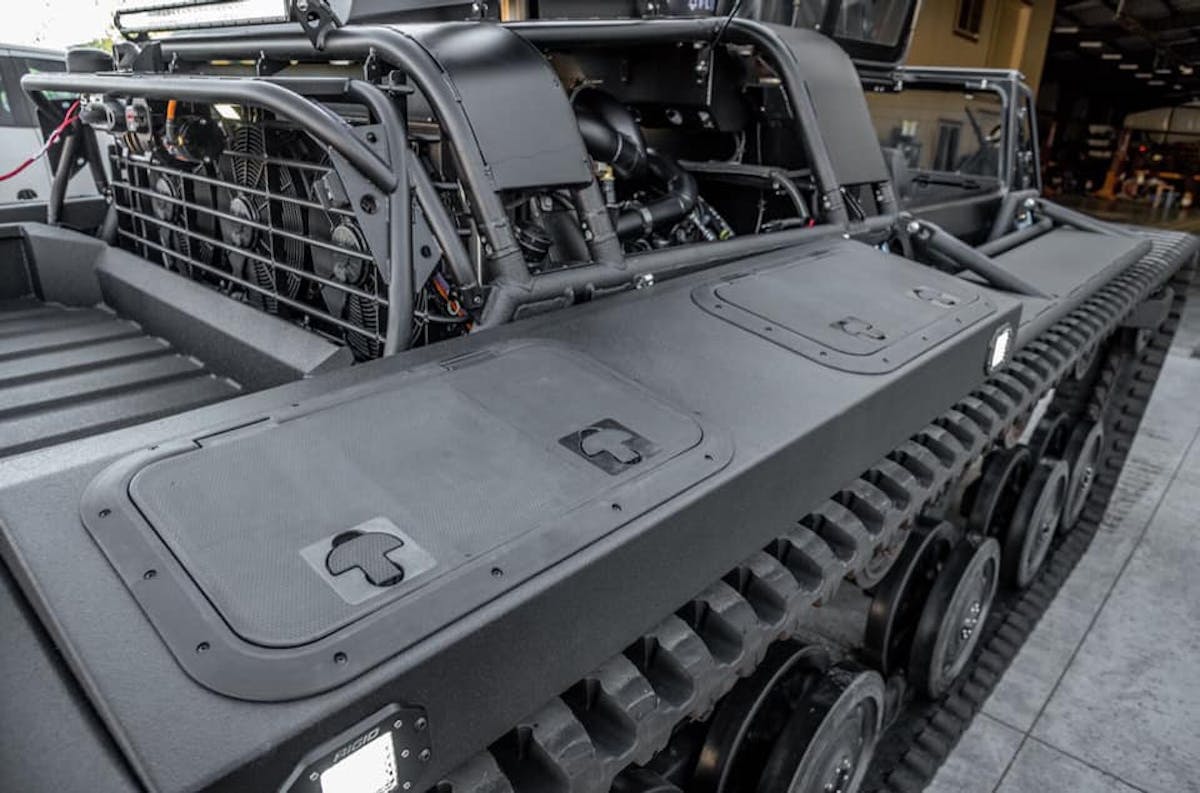 It’s powered by a 6.6-liter Duramax turbodiesel engine generating 800 hp and 1000 lb-ft of torque, tuned by Pacific Performance Engineering. Connected to an Allison 1000 heavy-duty transmission, the tank is capable of a top speed of over 55 mph, making it the world’s fastest dual-tracked vehicle.
