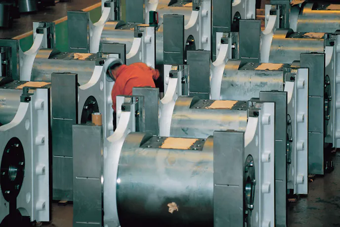(Left) Regardless of their size, all RT-flex engines utilize a beautifully machined gondola-type bedplate engineered to provide a rigid platform for the crankshaft. Here a team oversees the final stages of the crankshaft installation in an eight-cylinder example. (Right) The cylinder jackets are created from individual cast-iron cylinder blocks that are bolted together for maximum rigidity, which adds to longevity. While similar to the 14-cylinder RT-flex96c engine, this particular example in assembly is a 10-cylinder version.