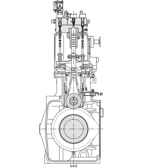 The fuel injection pumps, like the valve drives, are double-valve controlled units, with separate suction and spill valves regulated through eccentrics on hydraulically-actuated lay shafts. This allows variable fuel injection timing for improved part-load fuel consumption and to allow for variance in fuel quality.