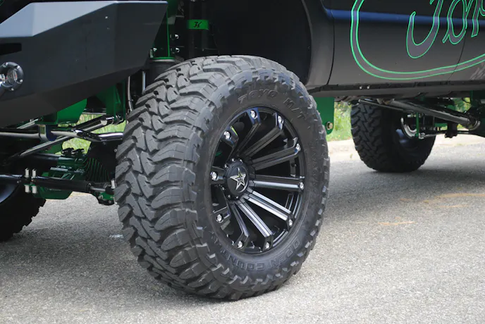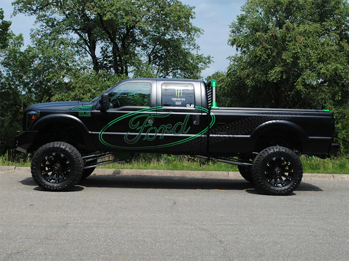 The exterior of the truck was painted matte black and has Monster Energy‘s “green” paint and decals throughout. Fab Fours front and rear bumpers were mounted helping to add an aggressive look to the truck. Then some Vision X LED Light Bars were mounted on the front bumper. In the back, a Backbone Industries custom headache rack was mounted along with a Bedslide in the bed.