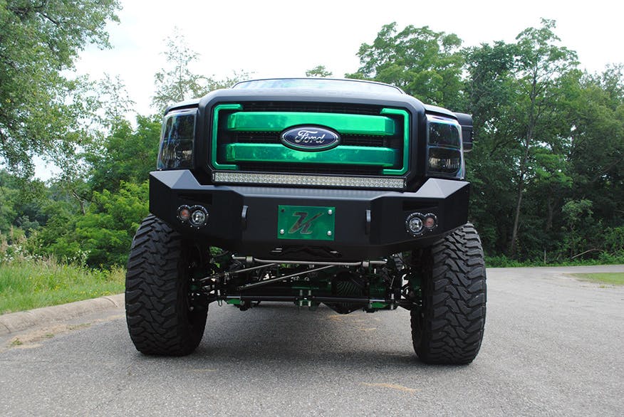 The base truck is a 2012 Ford F-250 Crew Cab Long Bed 4×4. There have been 3,500 miles put on the truck since it was built. The entire suspension was pulled off and a Kelderman 8 to 10” 4 link lift kit was added that is controlled by AccuAir’s e-Leveling system. The Kelderman kit features dual Viair 444 air compressors and dual 3 gallon air tanks. To keep the ride soft and comfortable, a set of custom black Sway-A-Way remote reservoir shocks were added.