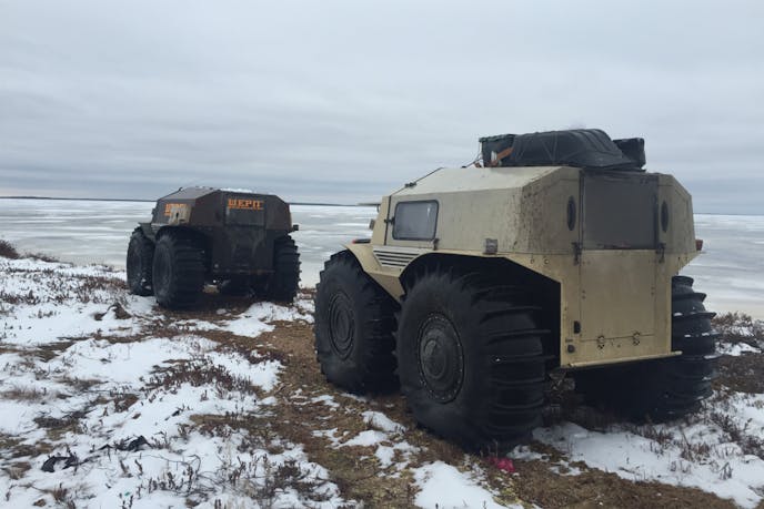 Space inside the tractor allows for six passengers, while the rear allows for 11. Supply-wise, the vehicle can carry nearly 5,000 pounds. The tracks are obviously great for the snow, and make water travel also possible.