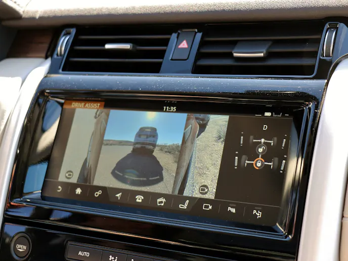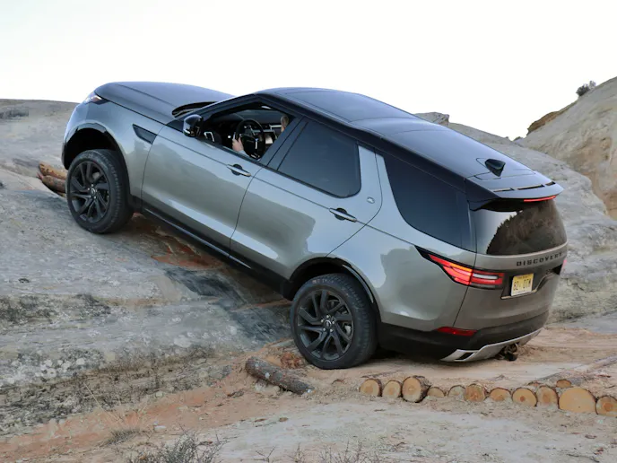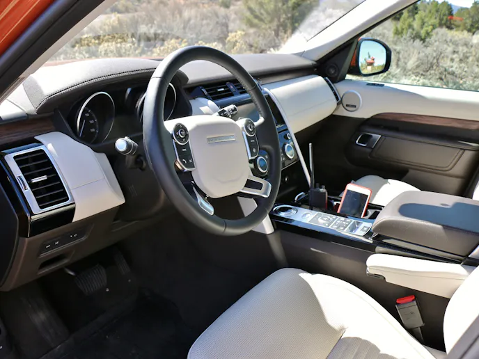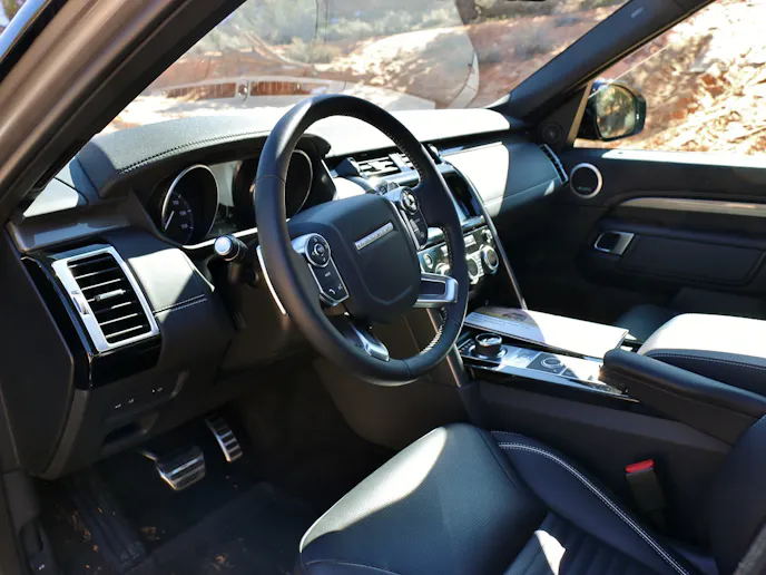 We drove a Discovery for two days. Correction: We drove a Discovery HSE Luxury with the supercharged 3.0-liter V6 (and the available Dynamic Design Package) the first day and a Discovery HSE Luxury with the turbocharged 3.0-liter diesel V6 the second day. Both are paired with an eight-speed automatic and capable of moving all 4,800-plus pounds of the Discovery at a respectable rate. The gas “Si6” gets the Discovery up to speed with 340 horsepower and 332 lb-ft of torque; the diesel “Td6” does it with 254 horsepower and 443 lb-ft. Although the diesel gets the best fuel economy of the two engines (21 city/26 highway/23 combined vs. 16/21/18), it does carry a $2,000 premium over its gas counterpart and it’s not available in base SE-grade Discoveries.