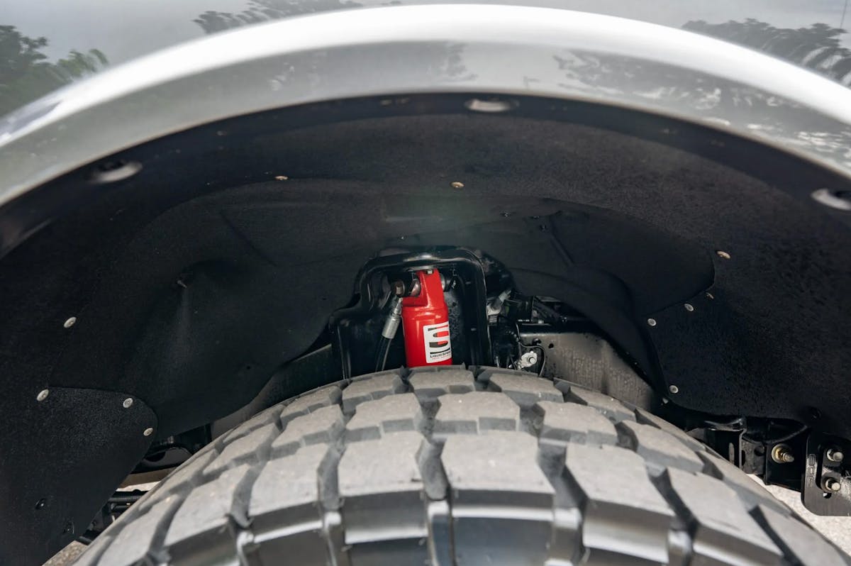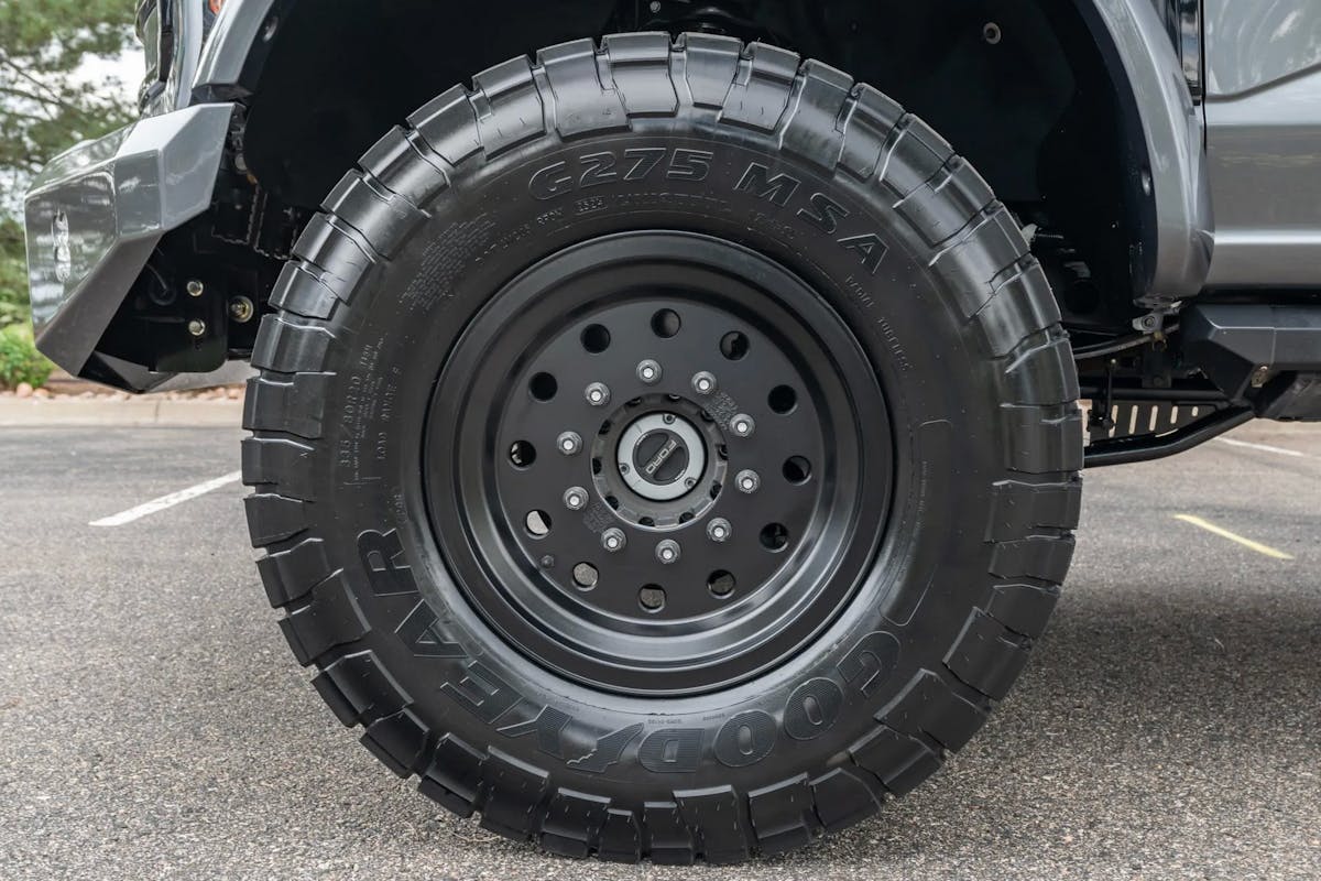 Where this F-550 truly separates itself is in the EOG upgrades. The centerpiece is the Liquid Spring Smart Suspension System, capable of raising the truck up to eight inches while offering three damping modes and one-touch leveling. This advanced system means the truck can be as equally composed on the highway as it is confident in deep wilderness. Black-anodized forged 20-inch wheels wrapped in massive 335/80 Goodyear G275 MSA tires (approximately 41s) ensure traction and presence. Heavy-duty steering and chassis enhancements, including upgraded tie rods, drag link, track bar, and front sway bar, reinforce durability under heavy loads while ensuring maximum control over unpredictable ground.