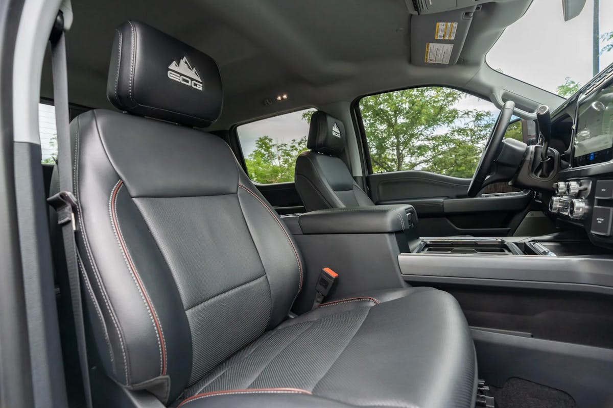 Inside, the cabin maintains the same balance of rugged capability and elevated luxury. Black Onyx leather with red contrast stitching and EOG-embroidered headrests create a striking interior atmosphere. Heated, ventilated, and power-adjustable front bucket seats combine comfort with durability, while the rear bench carries matching trim. Technology is equally advanced, with a 12.0-inch SYNC 4 touchscreen offering navigation and Apple CarPlay, a Bang & Olufsen premium audio system, WiFi hotspot, and a fully digital 12.0-inch instrument cluster. Overhead auxiliary switches, a console-mounted safe, and a dash-mounted suspension controller remind you this is a truck built for serious exploration, not just show.