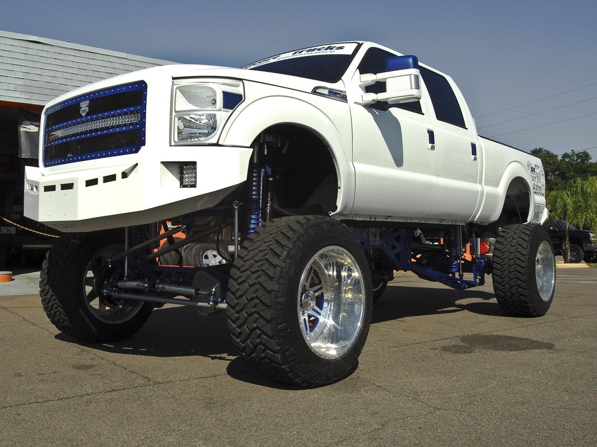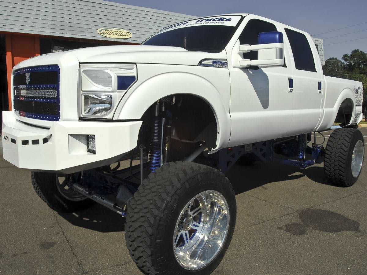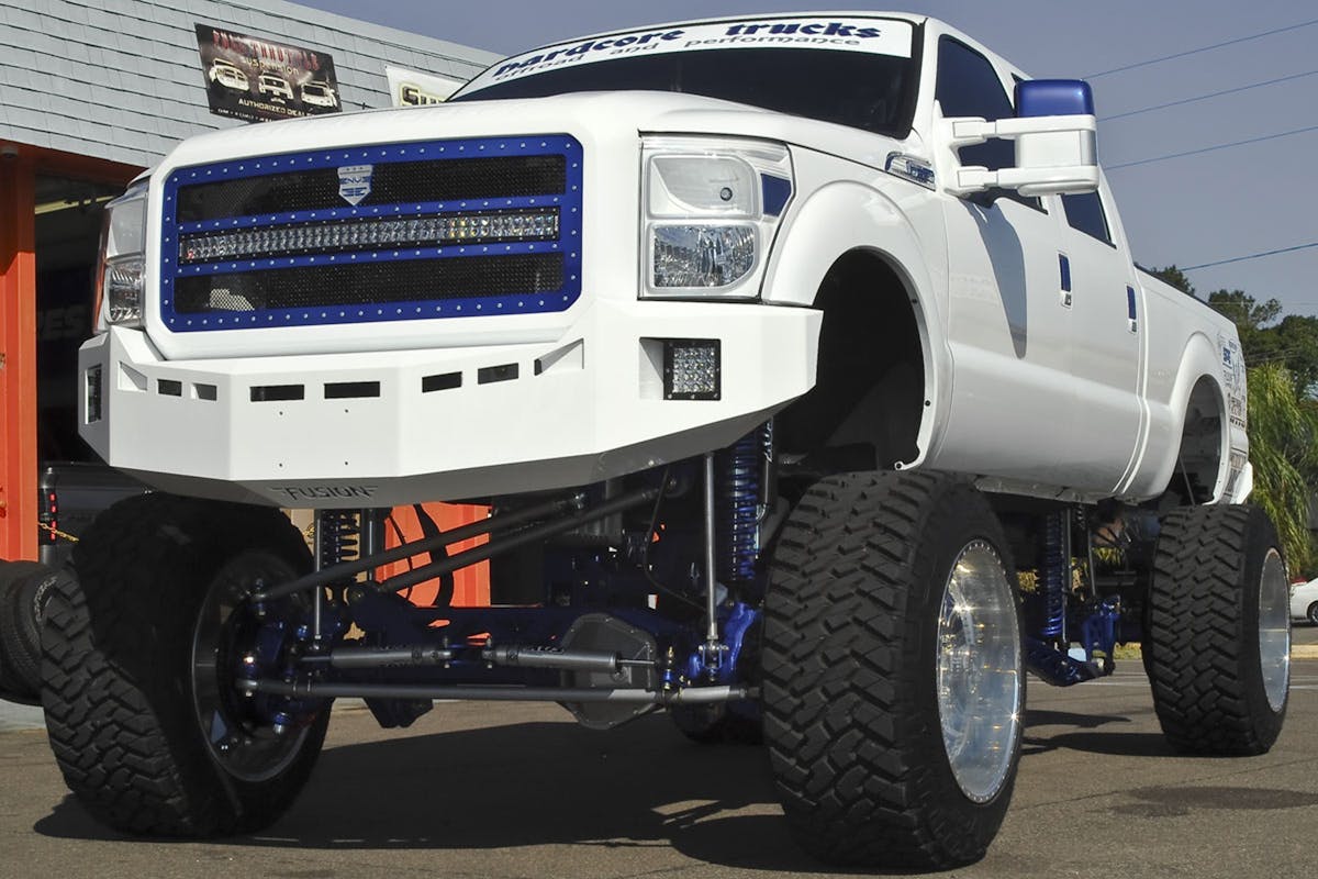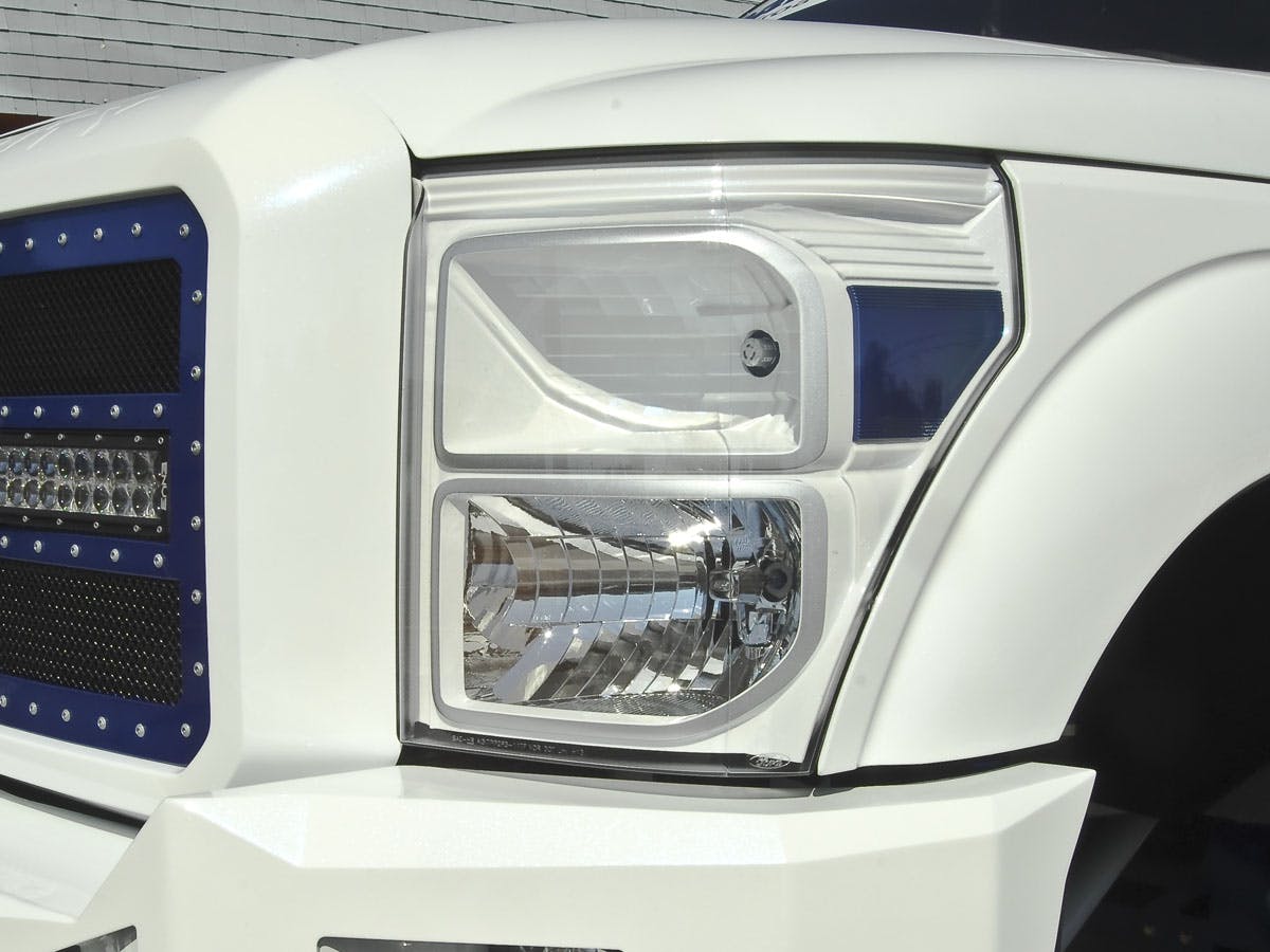 The front clip, cab, and bed of the truck were sent to Jim Depergola and his staff at Jim’s Body Shop. The Super Duty was put on a rotisserie, prepped, primed, and color coated with Valspar White Pearl. The blue accents on the truck are also Valspar Blue Pearl. The detail work on the body of the truck is second to none, from the blue inserts on the American Force Wheels to the accents on the mirrors and door handles, to the silver pearl trim rings around the headlights, all done with painstaking diligence; the paintwork on the truck is absolutely flawless.