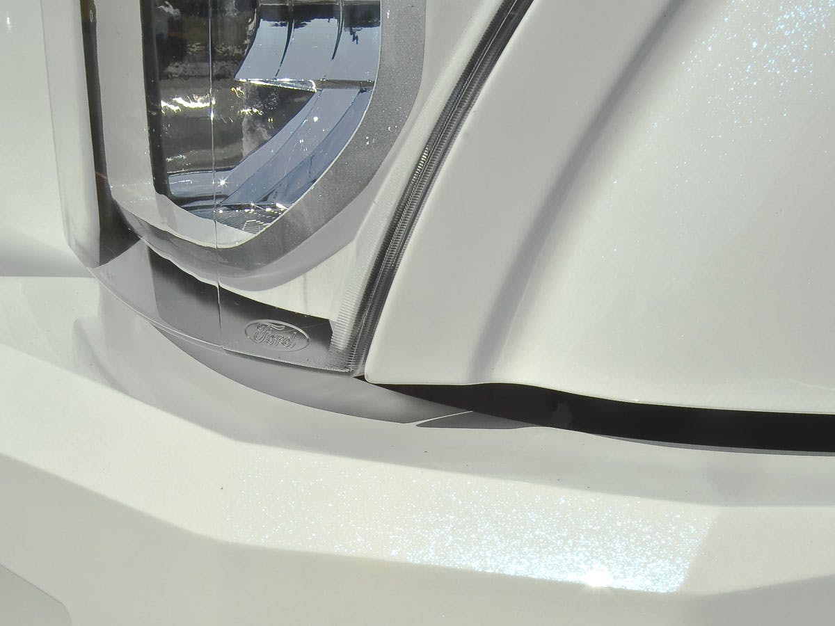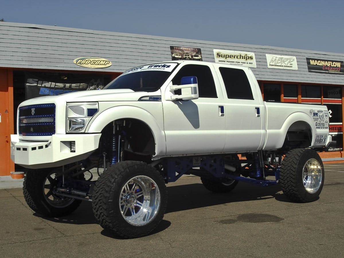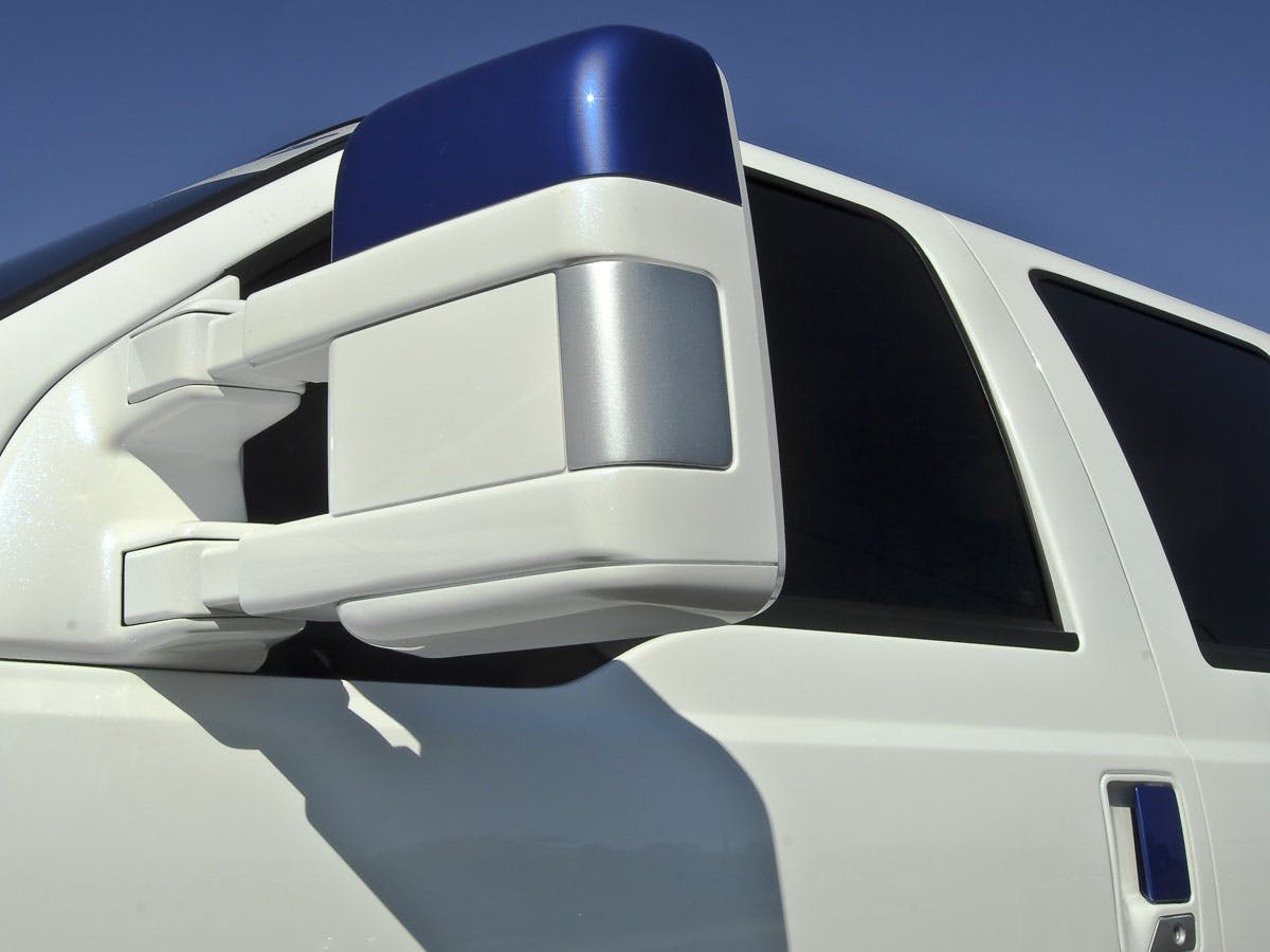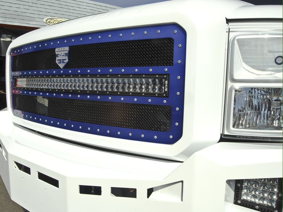 The front clip, cab, and bed of the truck were sent to Jim Depergola and his staff at Jim’s Body Shop. The Super Duty was put on a rotisserie, prepped, primed, and color coated with Valspar White Pearl. The blue accents on the truck are also Valspar Blue Pearl. The detail work on the body of the truck is second to none, from the blue inserts on the American Force Wheels to the accents on the mirrors and door handles, to the silver pearl trim rings around the headlights, all done with painstaking diligence; the paintwork on the truck is absolutely flawless.