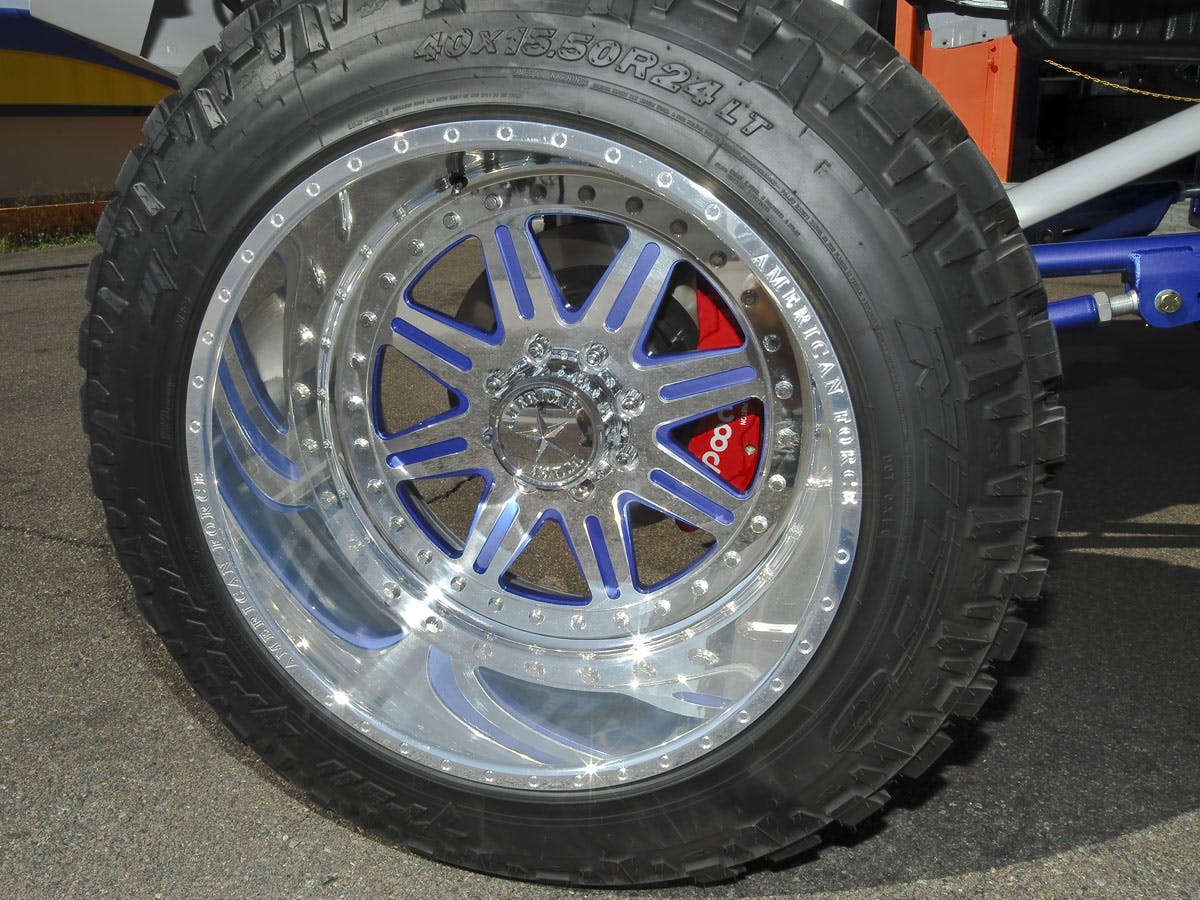 The power is transferred through a stock transfer case. The truck rides on two-piece aluminum American Force Wheels wrapped with 40×15.50×24 Nitto rubber. Six-piston, 11-inch Wilwood disc brakes on all four corners bring the truck to a safe, controlled stop.
