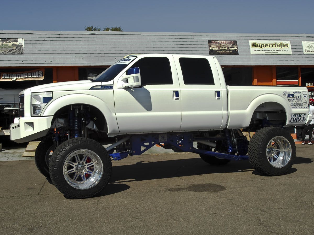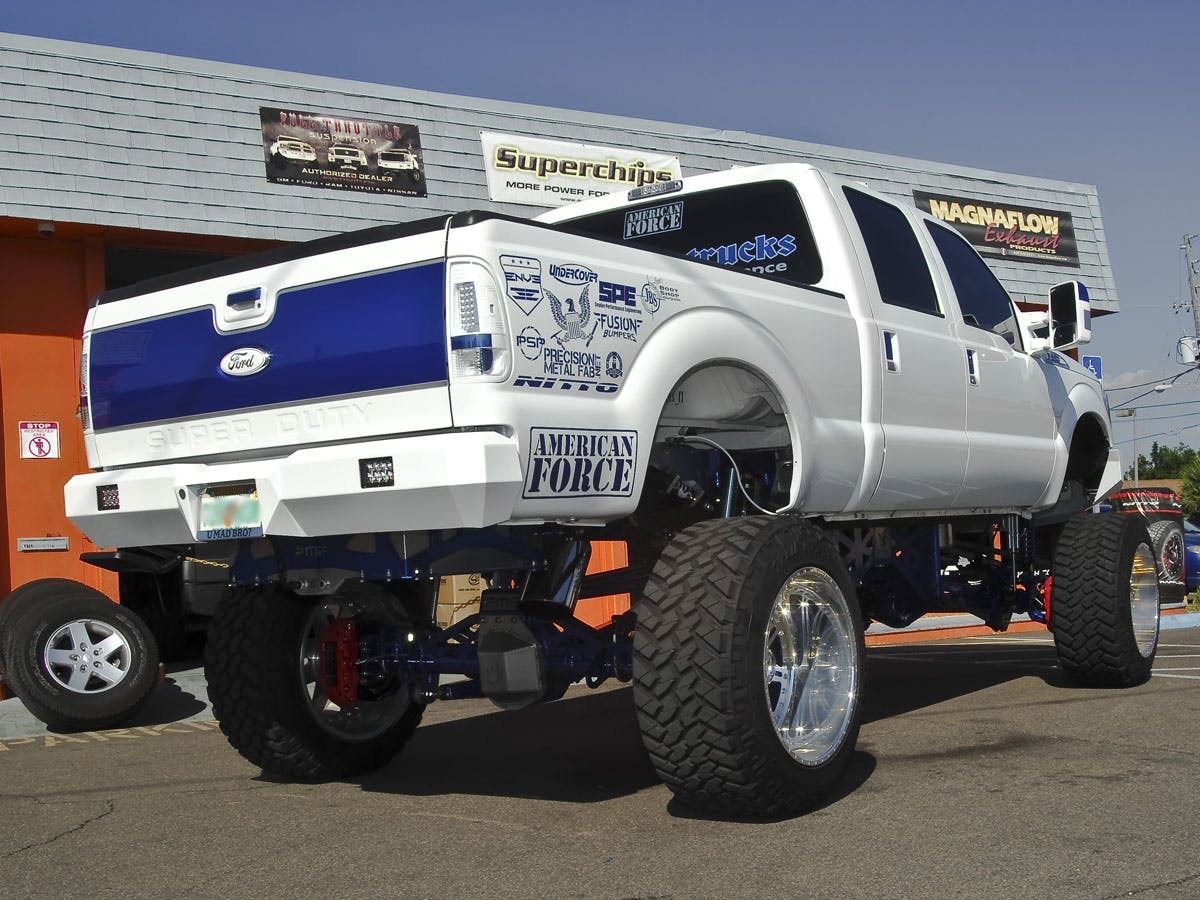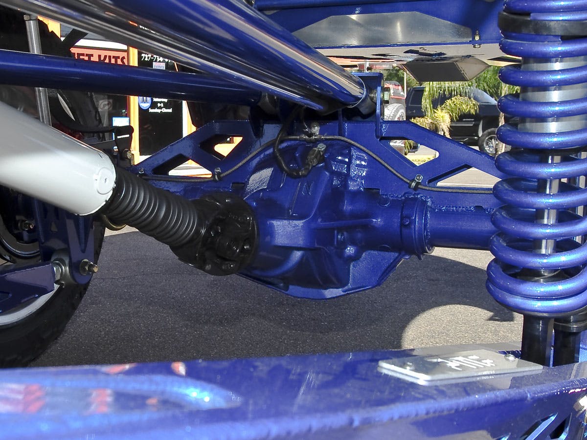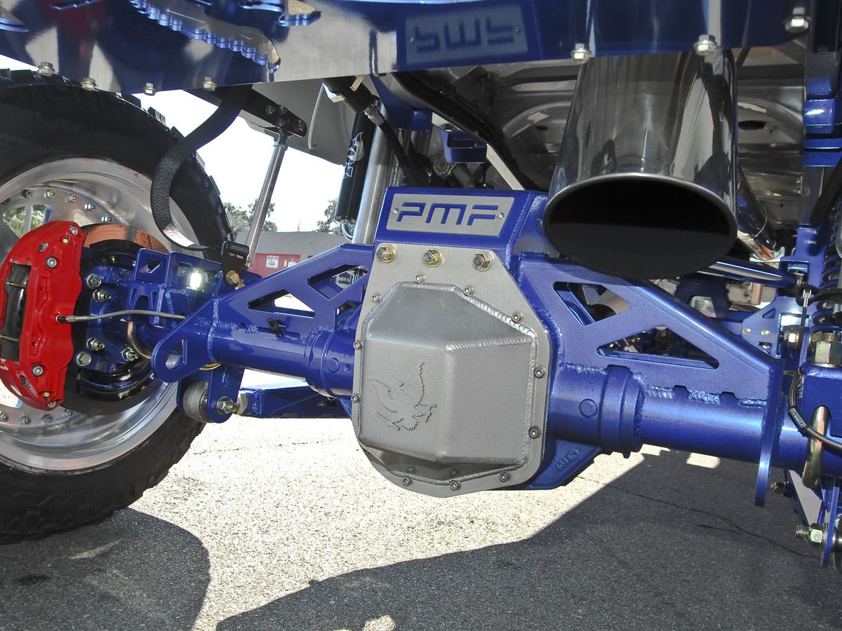 The 18-inch lift kit and all suspension components were designed and manufactured by Precision Metal Fabrication (PMF), in Tucson, Arizona. The front suspension under the Super Duty is a four-link system and the rear uses a 4.56 gear ratio and Ford OEM manual locking hubs. The rear suspension is PMF trailing arms, with Fox coilover bypass shocks. The rear drive axle is a Ford OEM Corporate 10.5-inch with a 4.56 gears