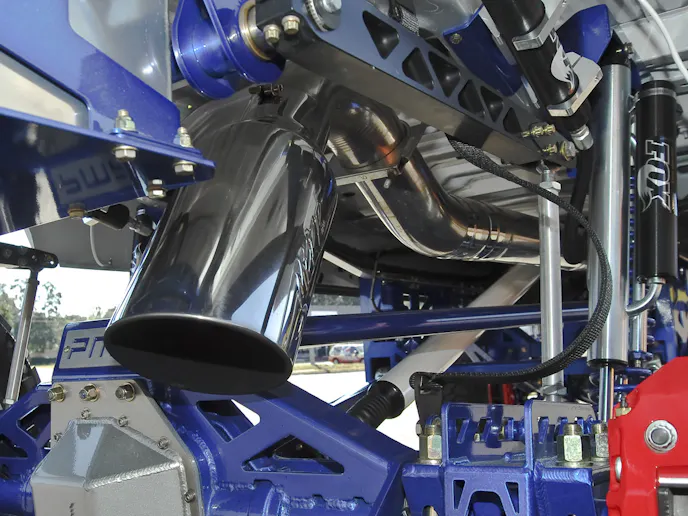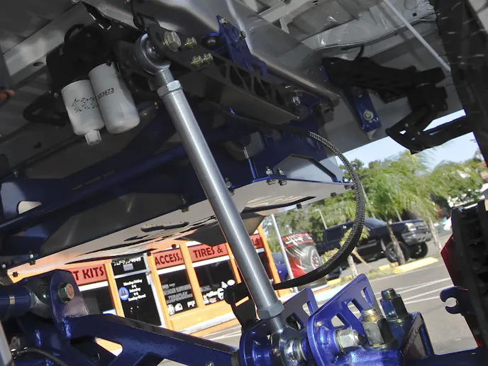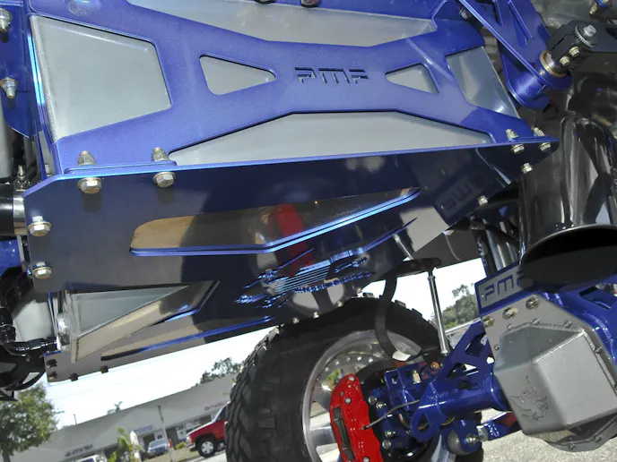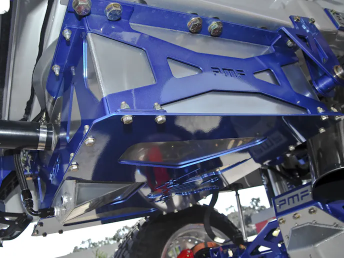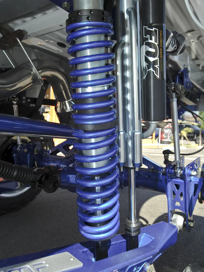 The 18-inch lift kit and all suspension components were designed and manufactured by Precision Metal Fabrication (PMF), in Tucson, Arizona. The front suspension under the Super Duty is a four-link system and the rear uses a 4.56 gear ratio and Ford OEM manual locking hubs. The rear suspension is PMF trailing arms, with Fox coilover bypass shocks. The rear drive axle is a Ford OEM Corporate 10.5-inch with a 4.56 gears