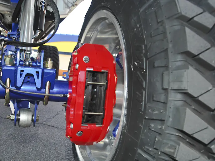 The power is transferred through a stock transfer case. The truck rides on two-piece aluminum  American Force Wheels wrapped with 40×15.50×24 Nitto rubber. Six-piston, 11-inch Wilwood disc brakes on all four corners bring the truck to a safe, controlled stop.
