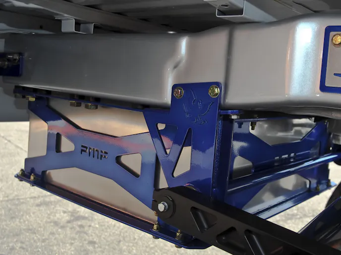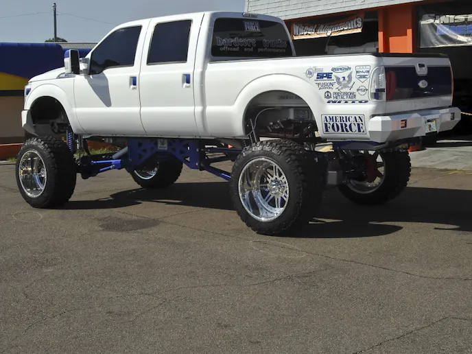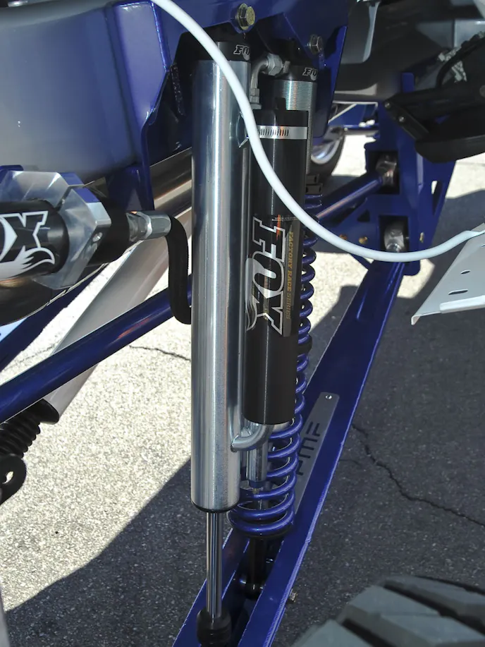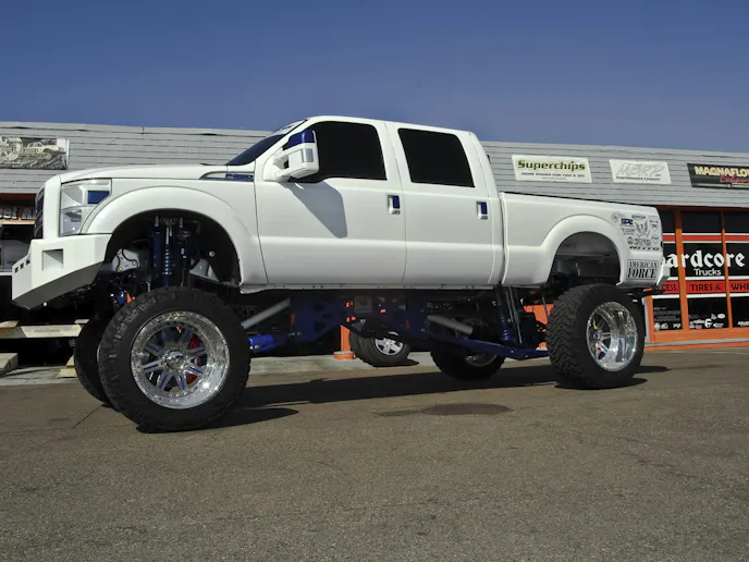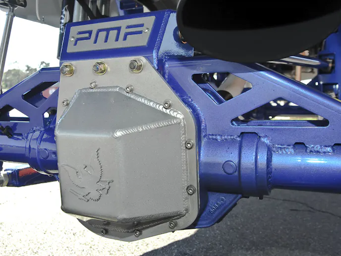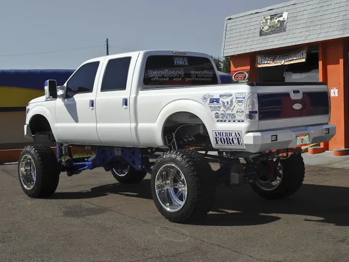 The 18-inch lift kit and all suspension components were designed and manufactured by Precision Metal Fabrication (PMF), in Tucson, Arizona. The front suspension under the Super Duty is a four-link system and the rear uses a 4.56 gear ratio and Ford OEM manual locking hubs. The rear suspension is PMF trailing arms, with Fox coilover bypass shocks. The rear drive axle is a Ford OEM Corporate 10.5-inch with a 4.56 gears