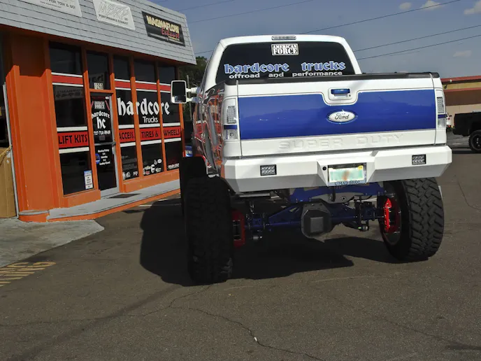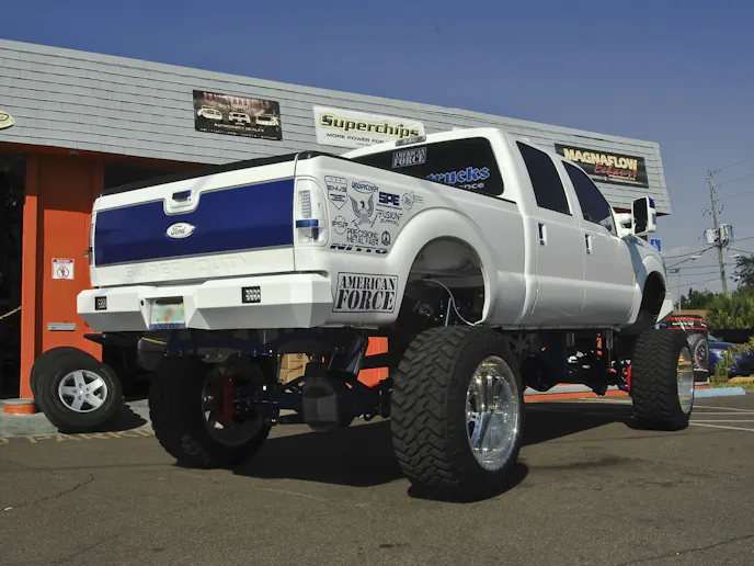 The 18-inch lift kit and all suspension components were designed and manufactured by Precision Metal Fabrication (PMF), in Tucson, Arizona. The front suspension under the Super Duty is a four-link system and the rear uses a 4.56 gear ratio and Ford OEM manual locking hubs. The rear suspension is PMF trailing arms, with Fox coilover bypass shocks. The rear drive axle is a Ford OEM Corporate 10.5-inch with a 4.56 gears