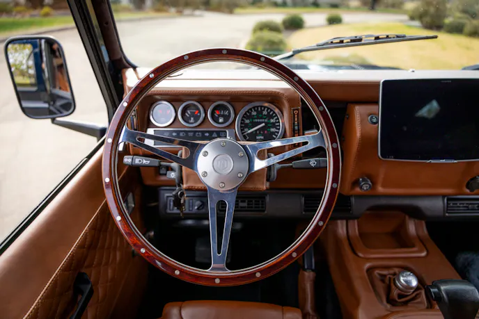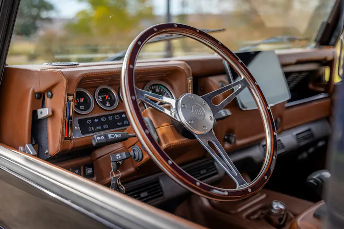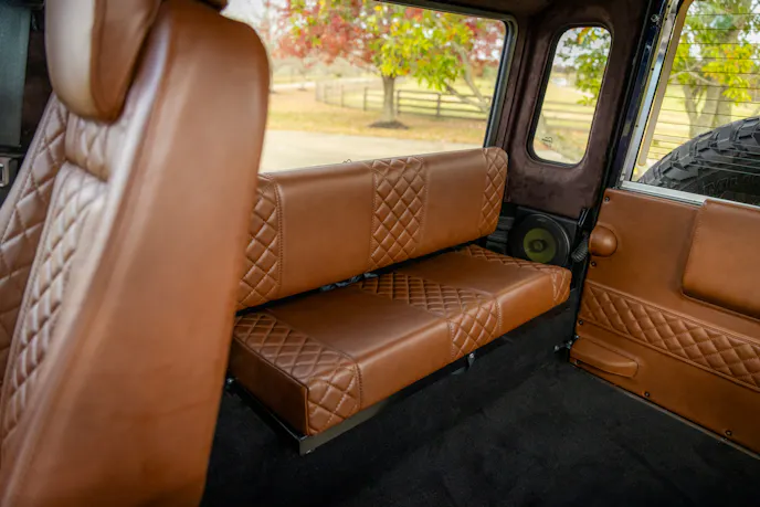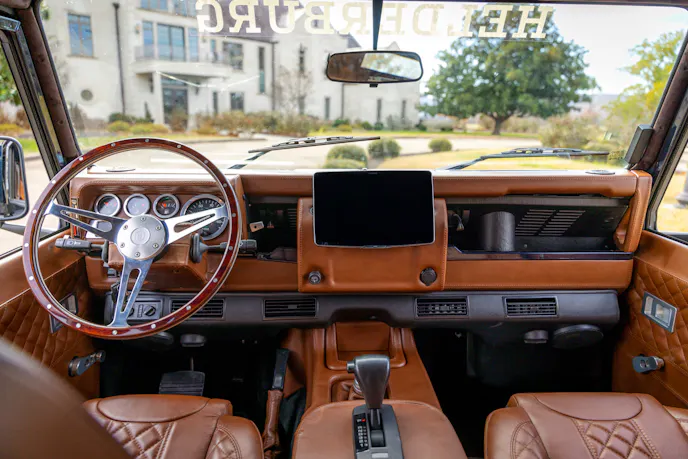 The body uses new heavier-gauge aluminum panels along with a Puma-style bonnet fitted with hand-cut aluminum louvers. Helderburg also says the truck underwent a meticulous frame-off rebuild, with the chassis stripped and painted to match the body. The rear cargo area was engineered to retain one of the Defender 110’s defining strengths: enough room for 4×8 sheets of plywood or sheetrock to lie flat.