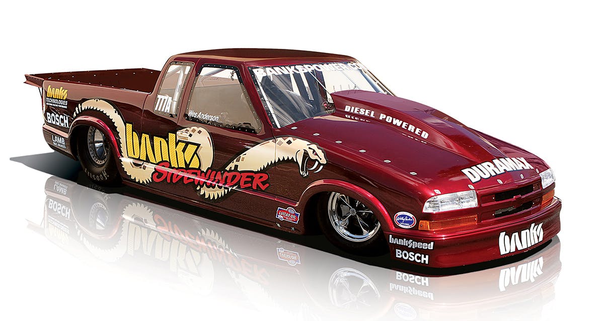 Then in 2007 the Banks “Sidewinder” S-10 pickup, driven by Wes Anderson and powered by a 1,250 horse Banks 866T V-8 diesel racing engine, became the “World’s Quickest and Fastest Diesel Drag Truck” with an NHRDA official 7.77 second ET and a top end of 180 mph in the quarter-mile (pictured below).