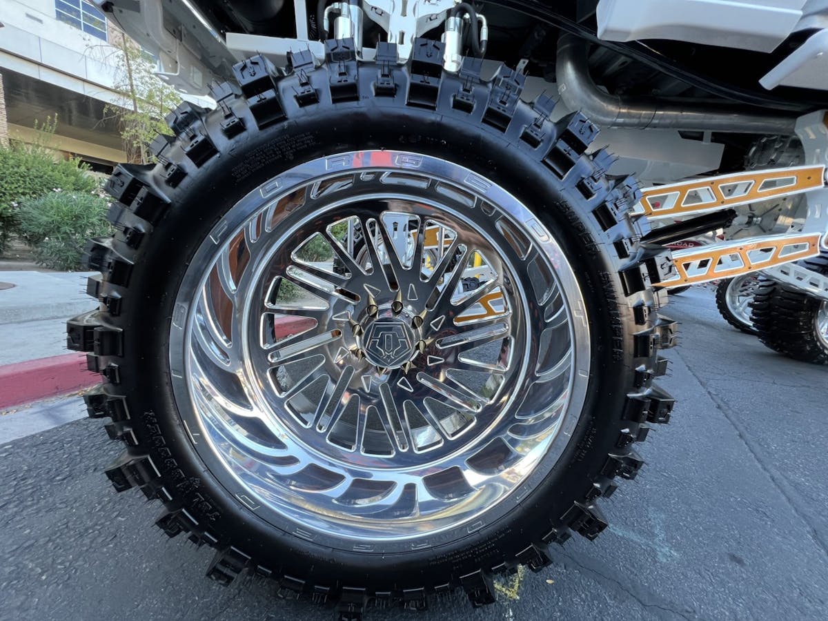 I reached out and talked to @sick_7_evan (Evan) about his truck and found out that this is actually 38-inches of lift. “The truck is still a work in progress, but it is almost done,” he said. “It has a custom 38-inch air ride lift that was designed by Ri Fab out of Idaho.” Regardless of what it is or who designed it, it is the largest thing here.