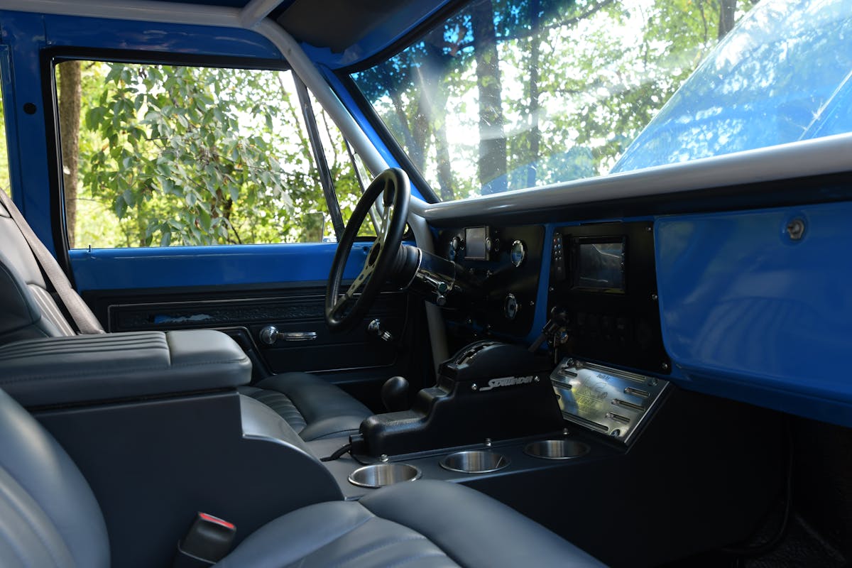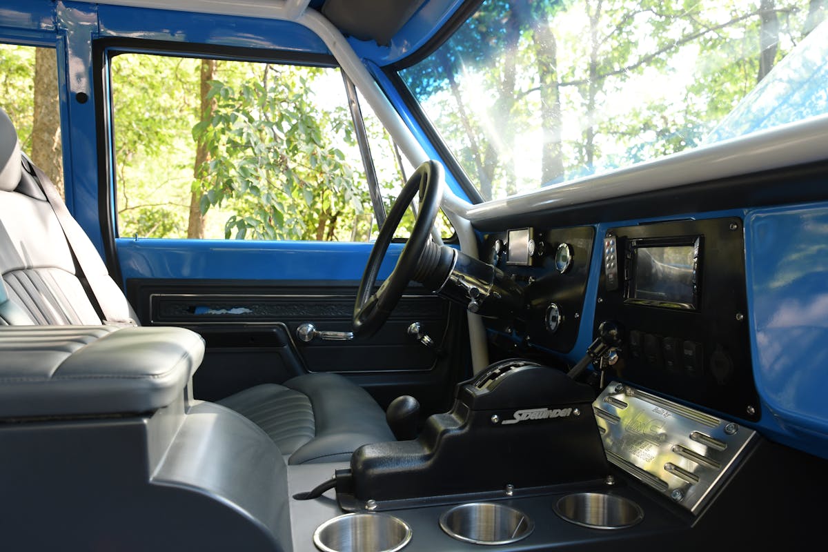 The custom interior is done up with charcoal-colored upholstery and everyone inside is protected by white piping for a roll cage. The dash is a custom piece that uses toggle switches for the lighting fixtures and a 7-inch touchscreen JVC Audio head unit for radio to control the MB Quart 6.75-inch front door speakers, 6×9-inch rear speakers, and two 10-inch subwoofers hidden under the custom center console.