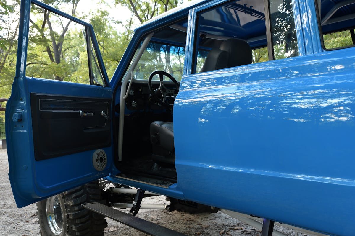 The custom interior is done up with charcoal-colored upholstery and everyone inside is protected by white piping for a roll cage. The dash is a custom piece that uses toggle switches for the lighting fixtures and a 7-inch touchscreen JVC Audio head unit for radio to control the MB Quart 6.75-inch front door speakers, 6×9-inch rear speakers, and two 10-inch subwoofers hidden under the custom center console.