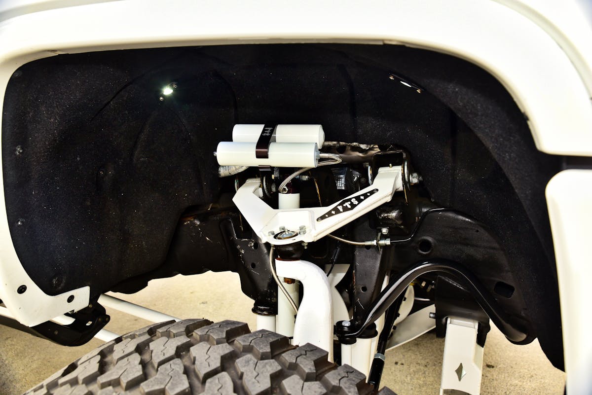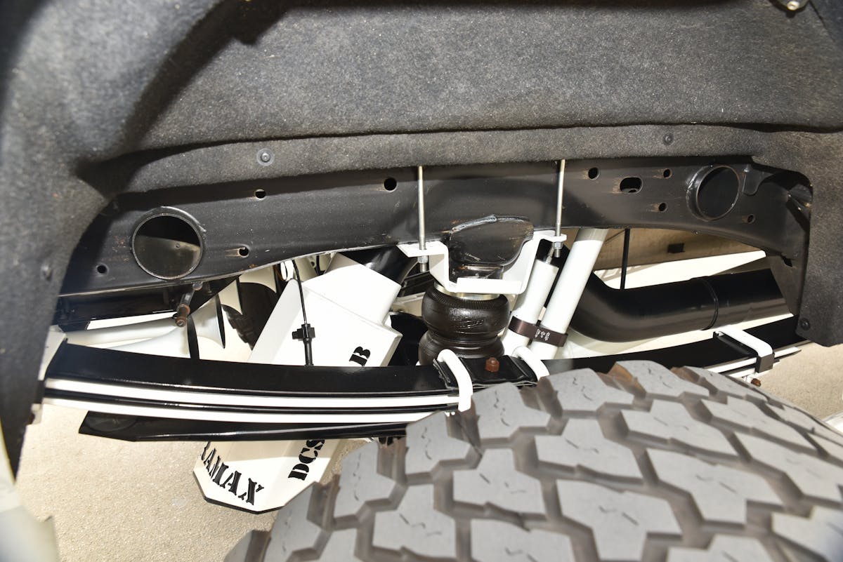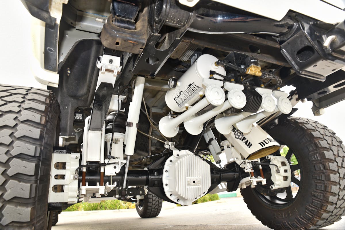 The rear benefits from Air Lift 7000 series airbags with white powder-coated brackets and gloss black rear axle housing with gloss white Mag-Hytech rear diff cover. Other goodies include Hornblasters train horns and a set of AMP Research Automation steps.