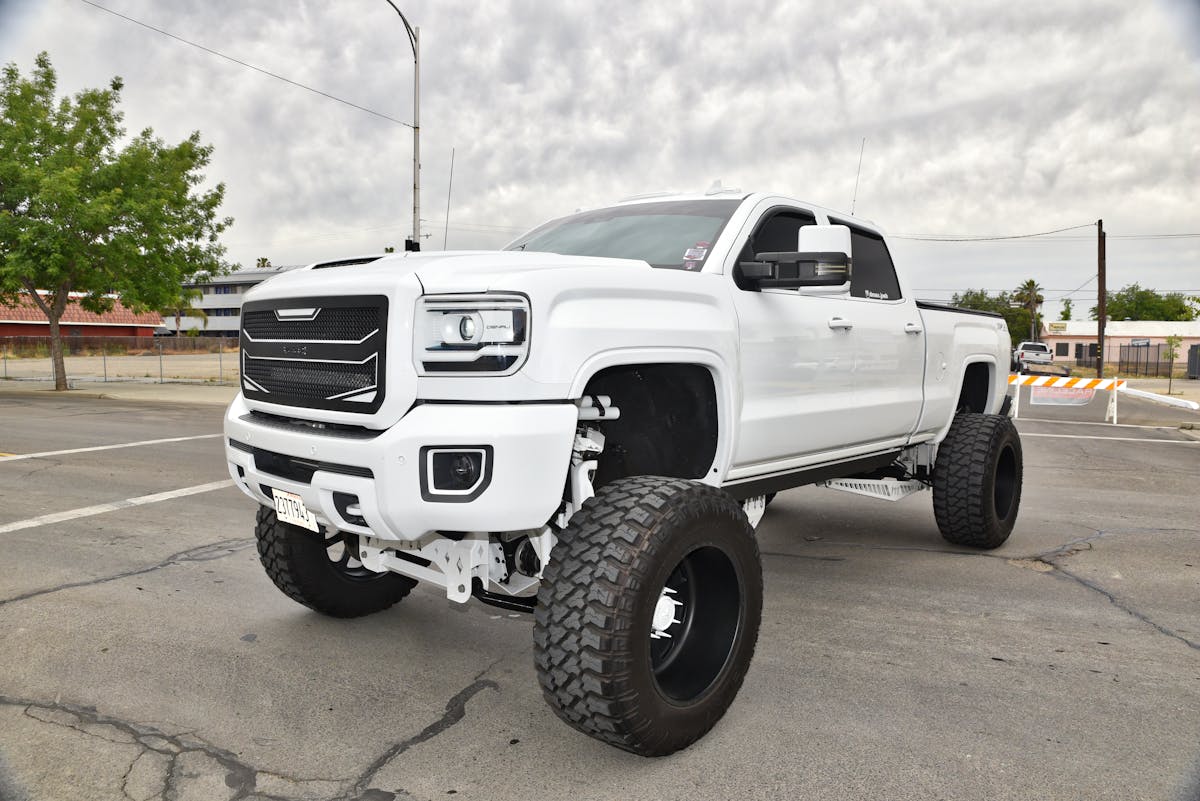 So let’s dive into Moore’s final version of his 2015 GMC Sierra Denali 2500HD Duramax! The truck features a 10-inch Full Throttle Suspension lift, reservoir mounts, and rear blocks powder-coated gloss white. To create a little;e contrast, the leaf springs feature alternating gloss black and white rear leaves. Like the rear suspension parts, the front also features a trick powder coating treatment in contrasting black and white.