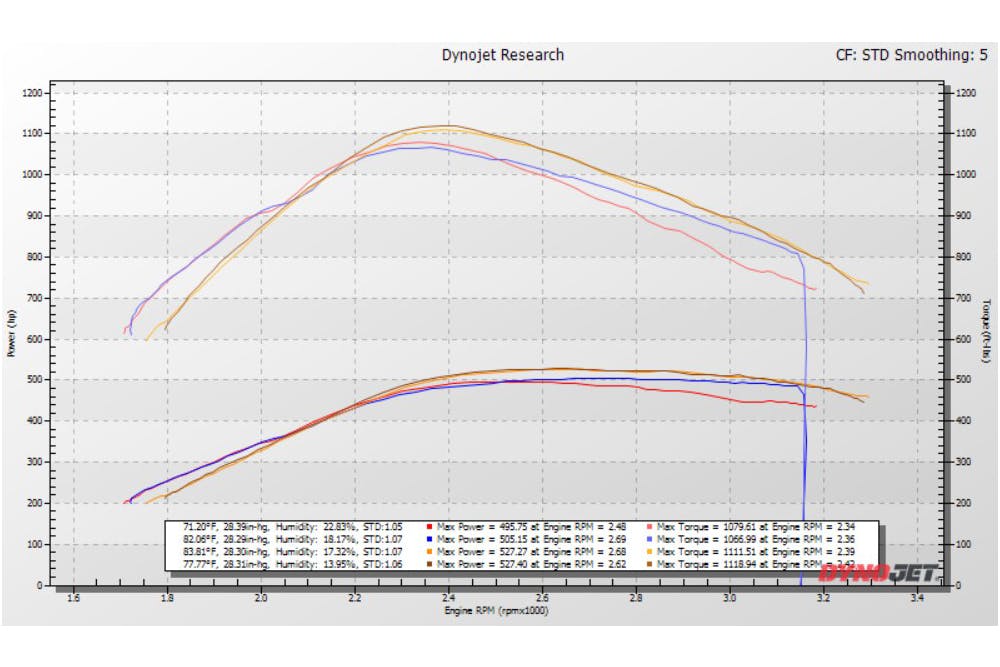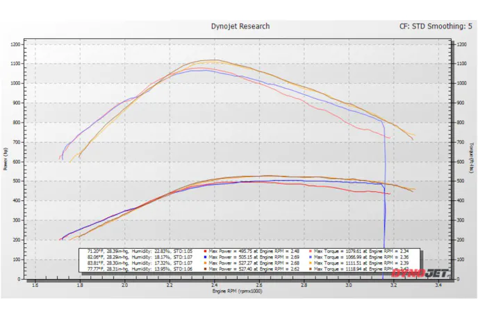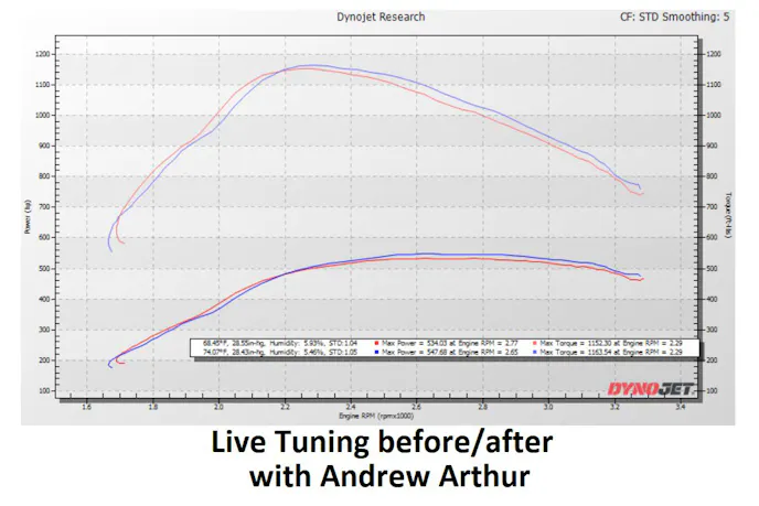 The first thing they decided to try was pretty simple: cutting off the stock muffler. From previous experience, the team was doubtful doing this would result in any significant power gains. To their surprise, however, they saw a nice increase of 22 horsepower at the wheels and 45 additional lb-ft of torque from peak to peak. More impressively, at 2,500 rpm, they noted an increase of 35 horsepower and 70 lb-ft of torque.