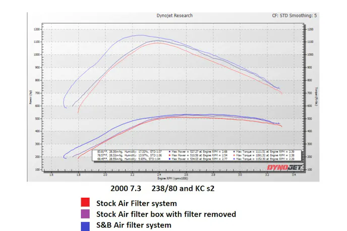 The team quickly huddled to work on the next move. The factory air filter was already removed and the stock airbox was propped up in the air (as to not suck dust and debris from the engine bay). Doubtful it would help but desiring to try anyway, the guys installed a fresh S&B cold air intake system on the 7.3L. As it turns out, adding an air filter back to the equation actually resulted in a measurable horsepower gain. An educated theory suggests that the S&B intake was doing two things—drawing cooler air and delivering it in a smoother manner to the engine.