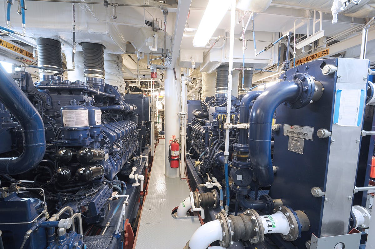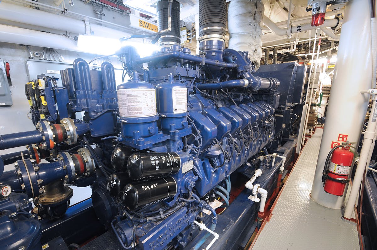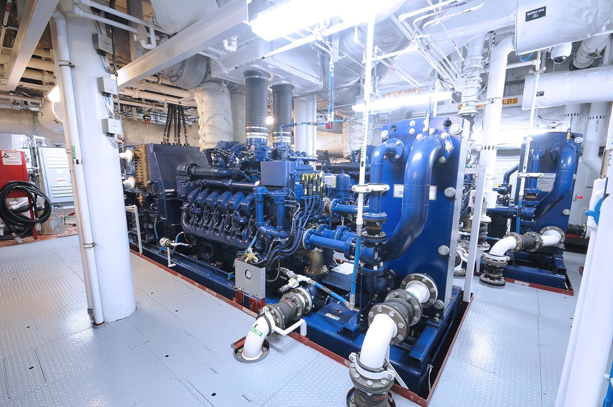 Two of these powerful diesels are MTU 16V 4000 M23S marine generator engines. The other two are MTU 12V 4000 M23S marine generator engines. All four continuous-rated diesel engines have a maximum rpm of 2,100 rpm and provide on-board power generation for all ship systems and electric propulsion motors. To supply emergency power, an MTU Series 60 marine generator set stands ready.