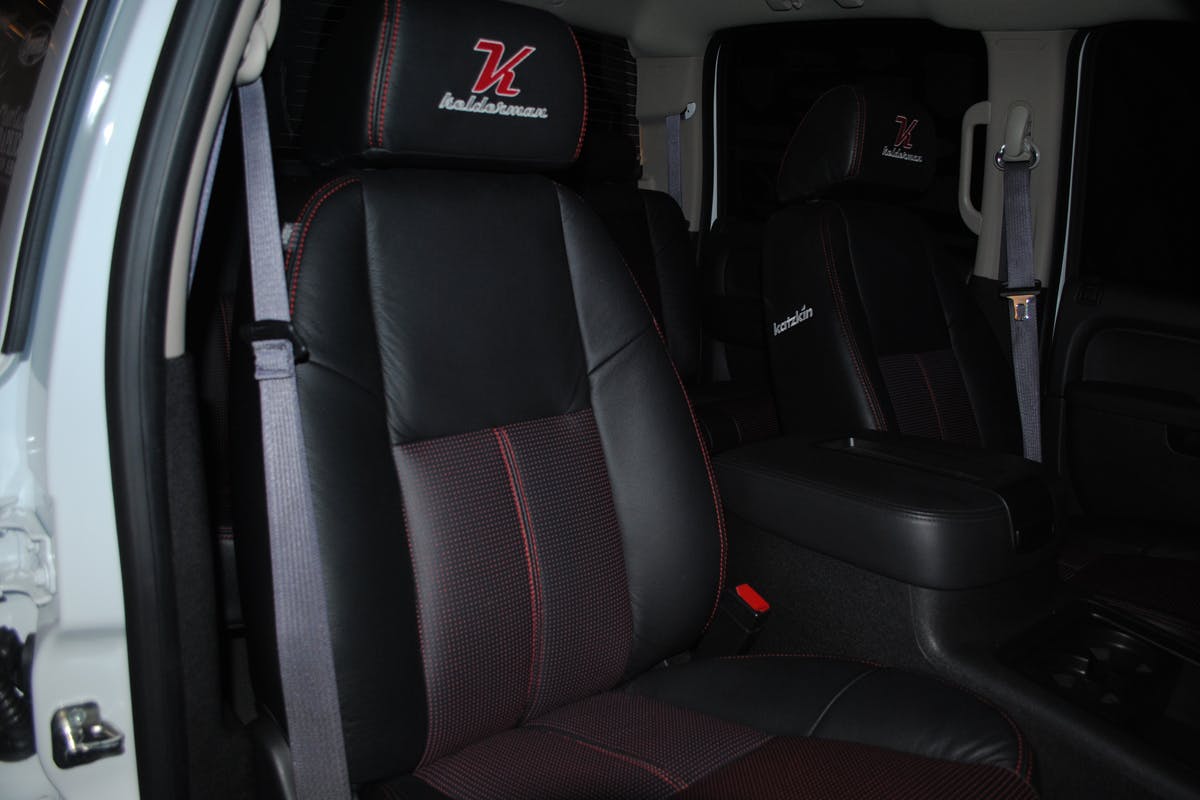 Inside the cab, the seats were reskinned with black Katzkin leather with red accents, providing ample comfort to everyone along for the ride. The stock sound-dampening material was ripped out and replaced with Dynamat material, adding to the level of ease while driving.