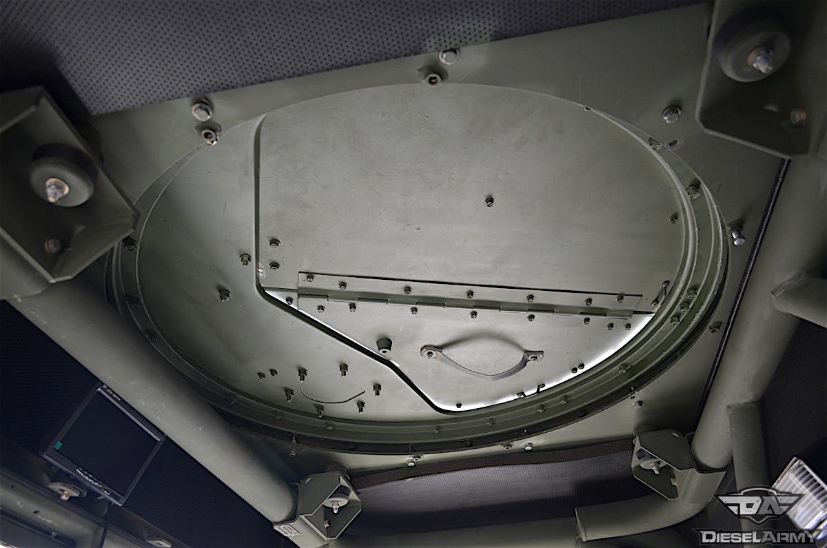 “We made it taller so a 6-foot-tall person can stand upright and still have room above his head to walk around,” says Bill Dozer of Those Military Guys. It’s also equipped with a full roll cage and an under-cab roll cage. It even has an armored roof with a hatch for access to the gun turret, along with a standing platform for the operator to stand on to fire the weapon.