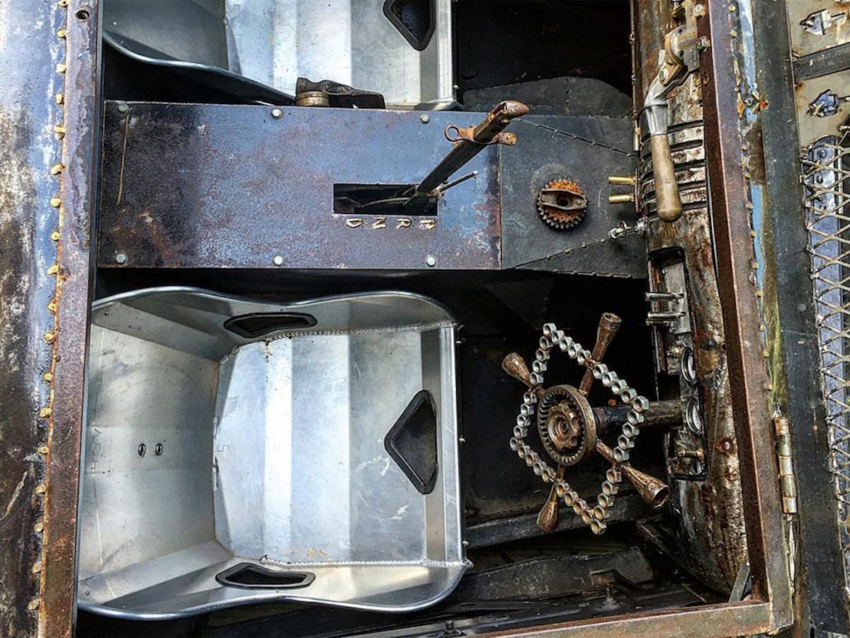 The body was clearcoated to retain its patina, and the driver sits on the right-hand side of the vehicle. Facing him is a square steering “wheel” with a four-way wrench as its centerpiece. He can control the ride height with airbags on all four corners, managed by twin Viair air compressors.