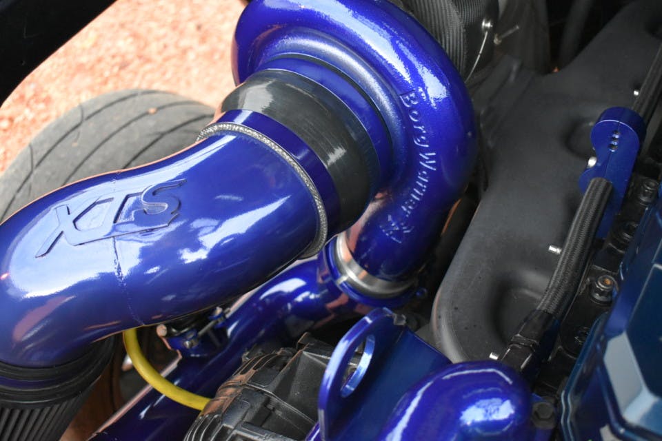 With that amount of fuel being pumped into the engine, there must be a good bit of air on the other side to mix with it. All of the boost this engine makes is credited to a Forced Inductions Gen 4 88/96/1.10 single turbocharger with Xccelerated Turbo Systems plumbing. The turbo hangs on a Steed Speed exhaust manifold and the boost pressures are controlled with a TurboSmart Blow Off Valve.