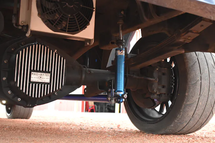 This 48RE features a Bonifante 27-spline input shaft, Maraging intermediate shaft, Suncoast billet output shaft, and an “Ernie Special” 200-PSI constant full manual valve body. Other upgrades include Suncoast billet drum, band, and their 2600 stall torque converter. Handheld controls on the interior are done with a Precision Performance shifter and keep fluid temperatures cool with a Derale Performance transmission cooler.